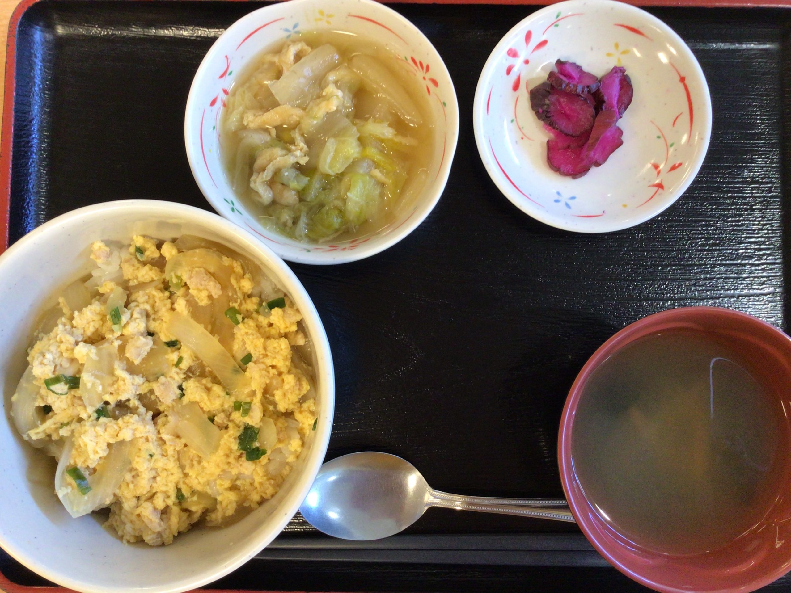 【昼食】 1.親子丼 2.白菜煮物 3.漬物 4.みそ汁