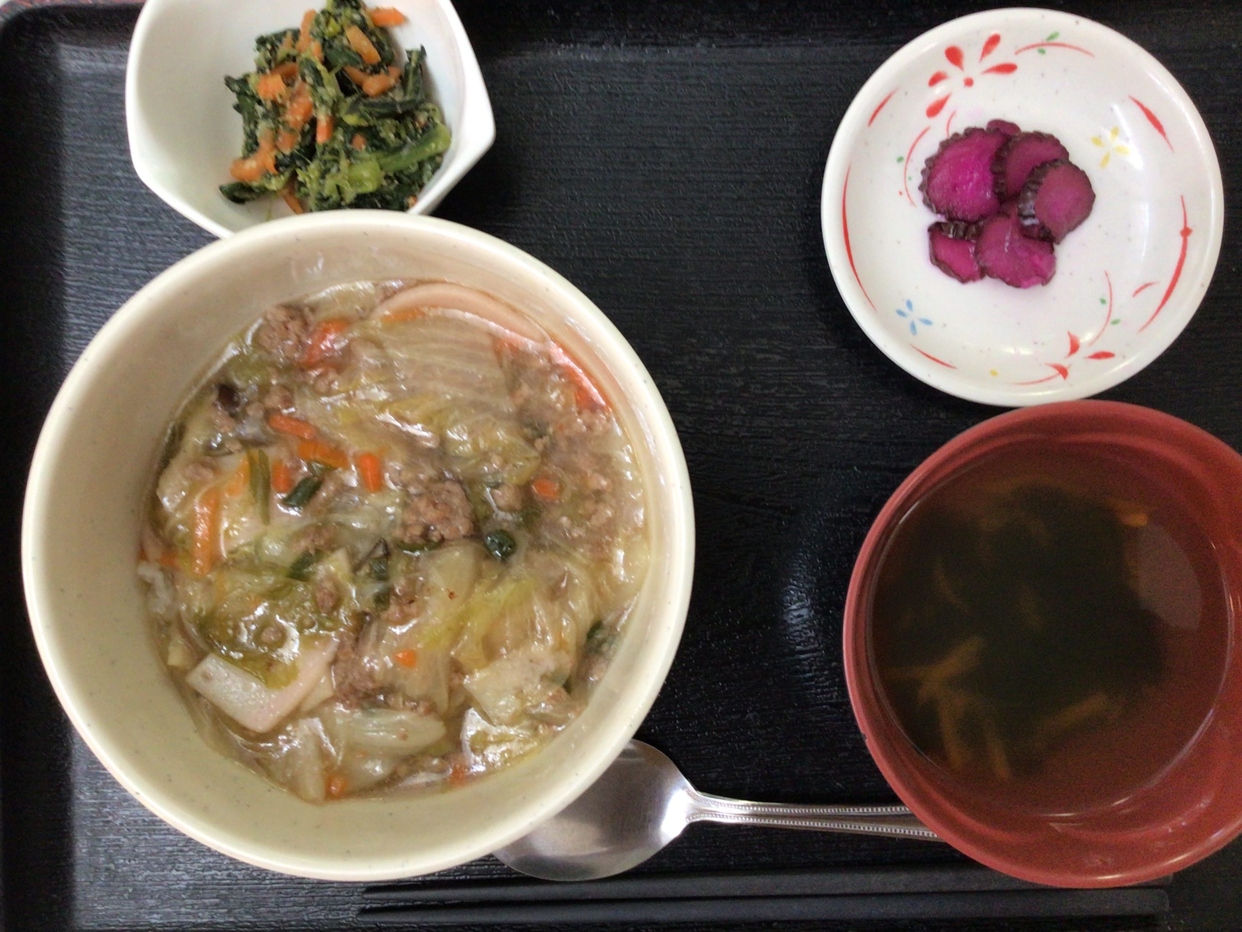 【昼食】 1.米飯 2.醤油ラーメン 3.ナムル 4.漬物