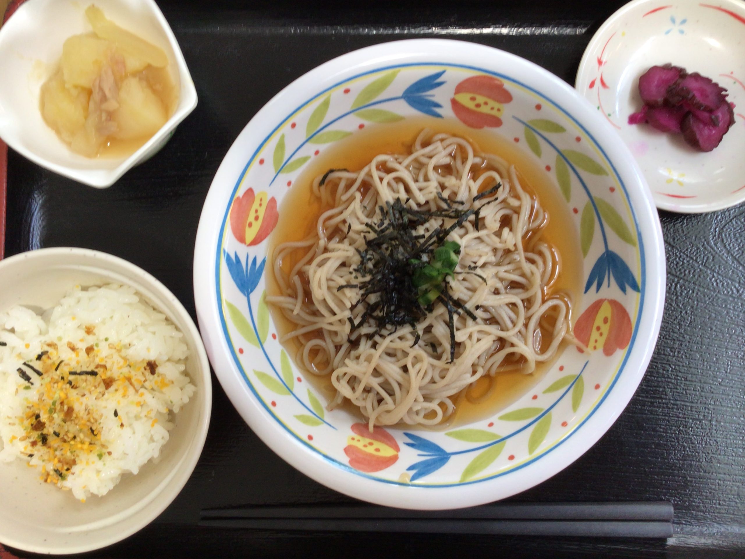 【昼食】 1.ふりかけご飯 2.ざるそば 3.ツナじゃが炒め煮 4.漬物