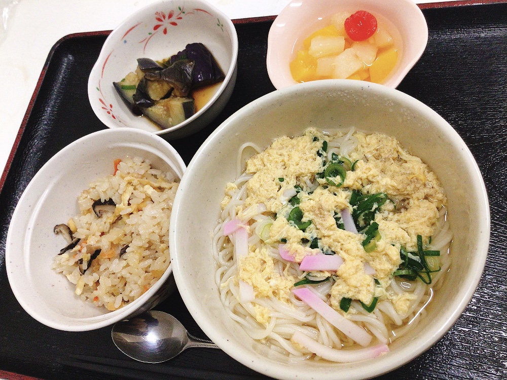 【昼食】 1.炊き込みご飯 2.かき玉にゅう麺 3.揚げナスポン酢 4.みかん缶 kcal611 蛋白質15.0g 脂質12.4g 食塩3.8g