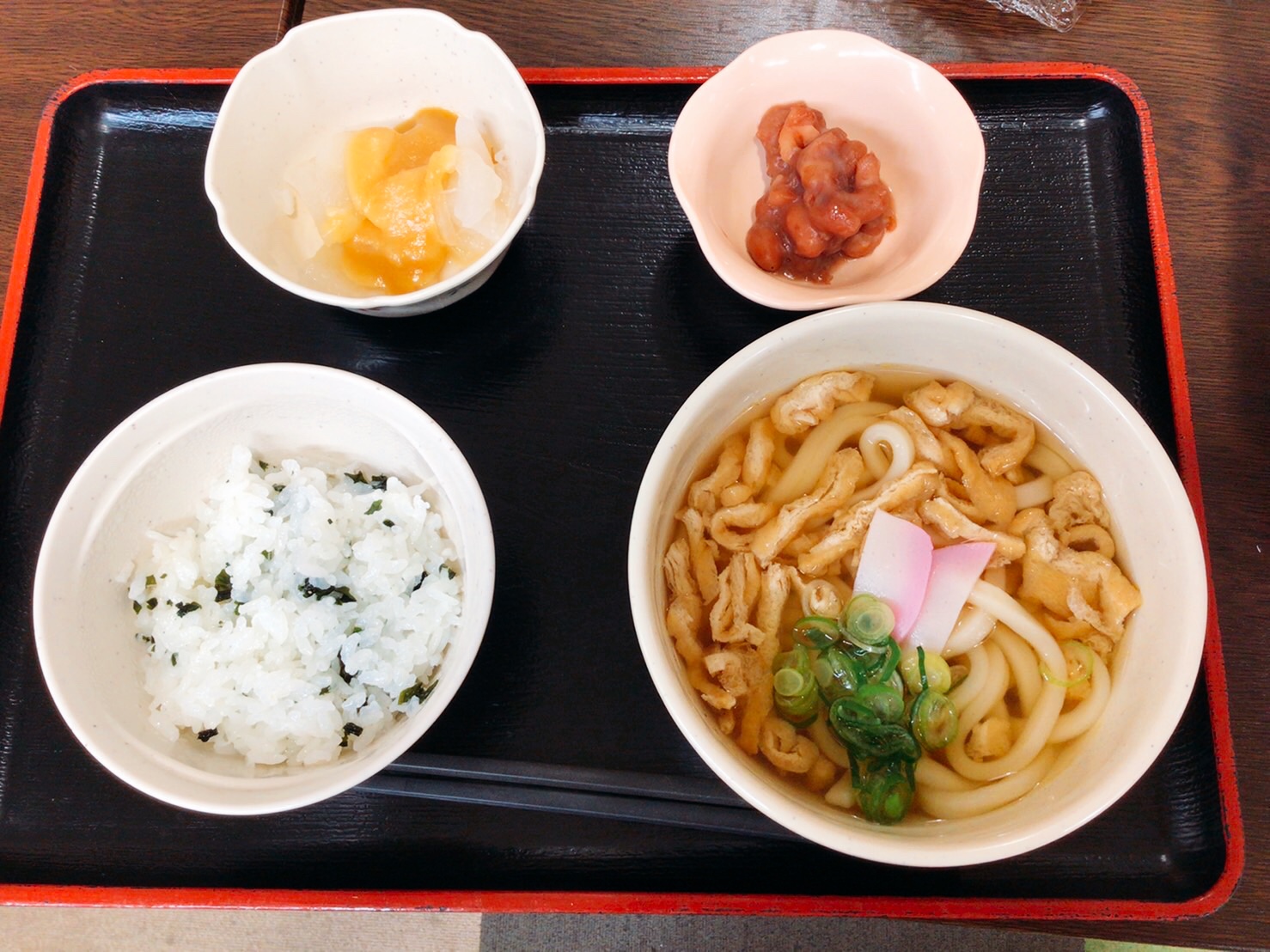 【昼食】 1.わかめご飯(小) 2.きつねうどん 3.大根の白みそかけ 4.金時豆煮 kcal542 蛋白質15.0g 脂質4.5g 食塩5.7g