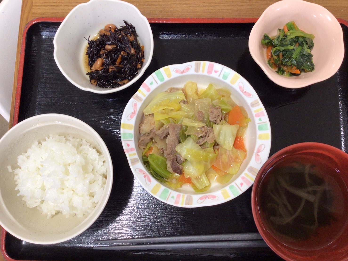 【昼食】 1.米飯 2.肉野菜炒め 3.ひじき煮 4.小松菜のわさび和え 5.すまし汁 kcal561 蛋白質15.6g 脂質10.8g 食塩3.5g