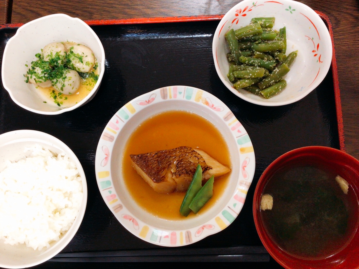 【昼食】 1.米飯 2.煮魚(かれい) 3.里芋のりまぶし 4.いんげんのごま和え 5.みそ汁 kcal514 蛋白質21.8g 脂質2.8g 食塩4.2g