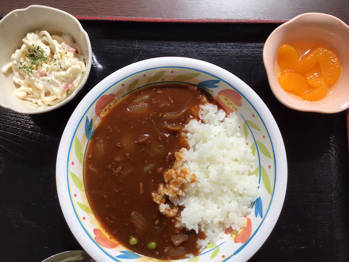 【昼食】 1.ハヤシライス 2.スパゲティサラダ 3.フルーツ缶 kcal546 蛋白質10.3g 脂質12.6g 食塩1.8g