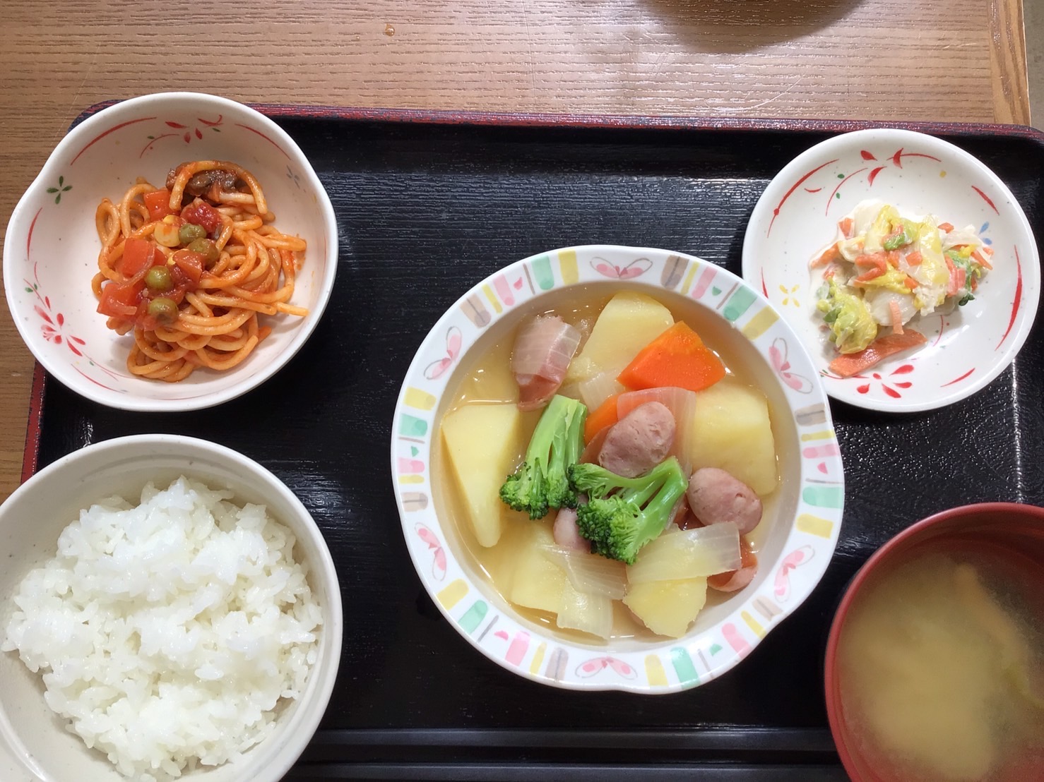 【昼食】 1.米飯 2.ポトフ(生姜風味) 3.ナポリタン 4.白菜マヨポン和え 5.みそ汁 kcal557 蛋白質11.7g 脂質9.5g 食塩2.3g