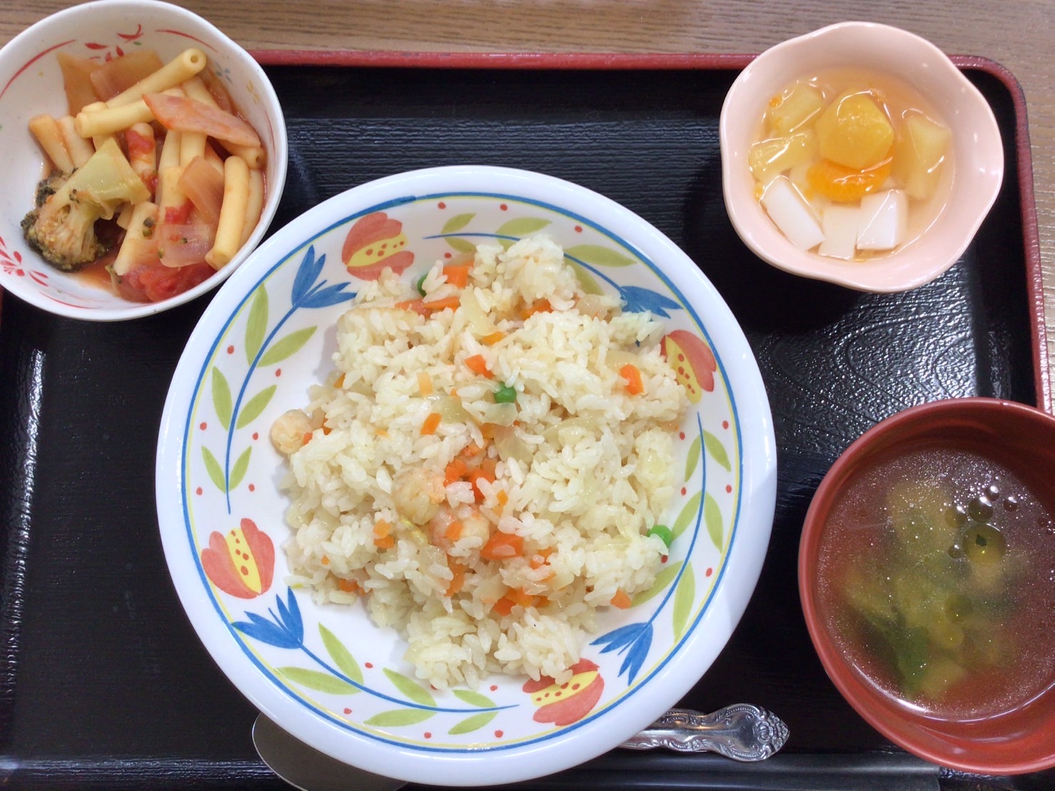 【昼食】 1.炊き込みピラフ 2.マカロニトマト煮 3.フルーツ杏仁 4.コンソメスープ kcal526 蛋白質12.8g 脂質12.3g 食塩1.2g