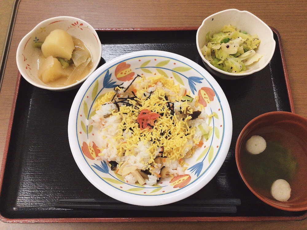 【昼食】 1.五目チラシ寿司 2.じゃがいもの煮物 3.キャベツゆかり和え 4.すまし汁 kcal454 蛋白質10.4g 脂質2.5g 食塩5.5g