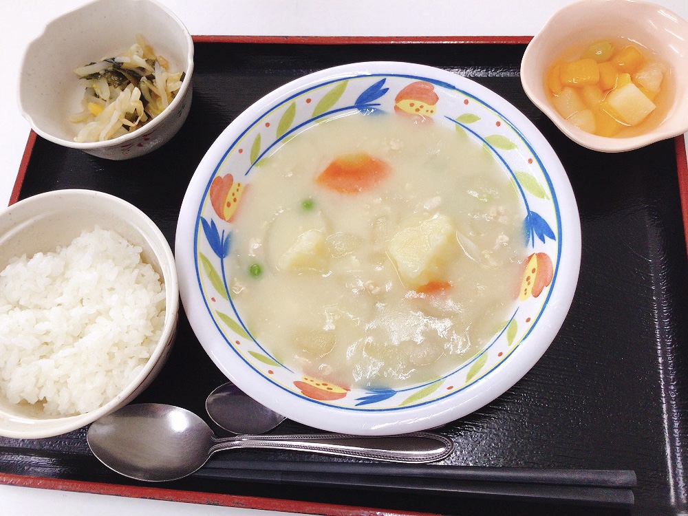 【昼食】 1.米飯 2.クリームシチュー 3.海藻サラダ 4.フルーツカクテル kcal517 蛋白質12.9g 脂質4.4g 食塩1.1g