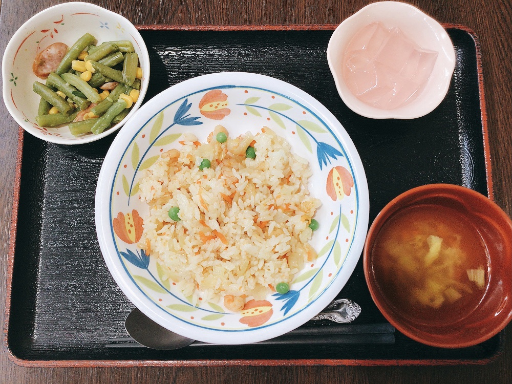 【昼食】 1.炊き込みピラフ 2.インゲンとコーンソテー 3.手作りゼリー 4.コンソメスープ kcal454 蛋白質11.9g 脂質12.5g 食塩1.3g