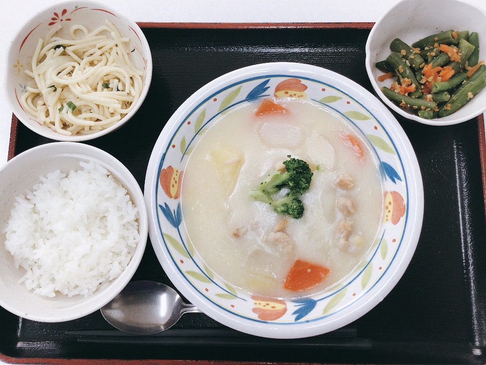 【昼食】 1.米飯 2.クリームシチュー 3.いんげんのピーナツ和え 4.青じそスパゲティ kcal560 蛋白質17.6g 脂質12.8g 食塩1.0g