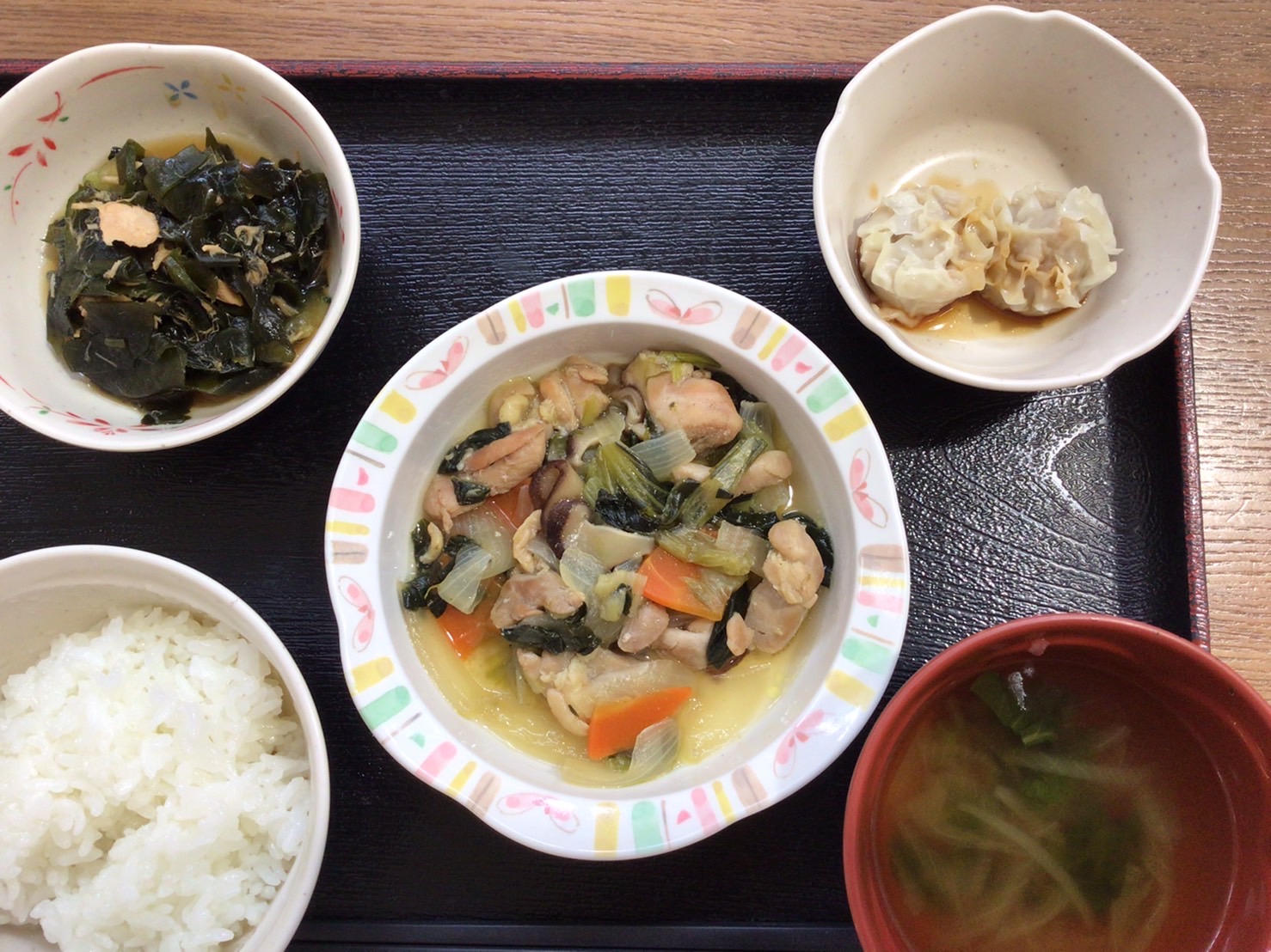 【昼食】 1.米飯 2.鶏と青菜の中華炒め 3.若布のツナ和え 4.蒸シューマイ 5.中華風スープ kcal479 蛋白質16.4g 脂質11.5g 食塩2.8g