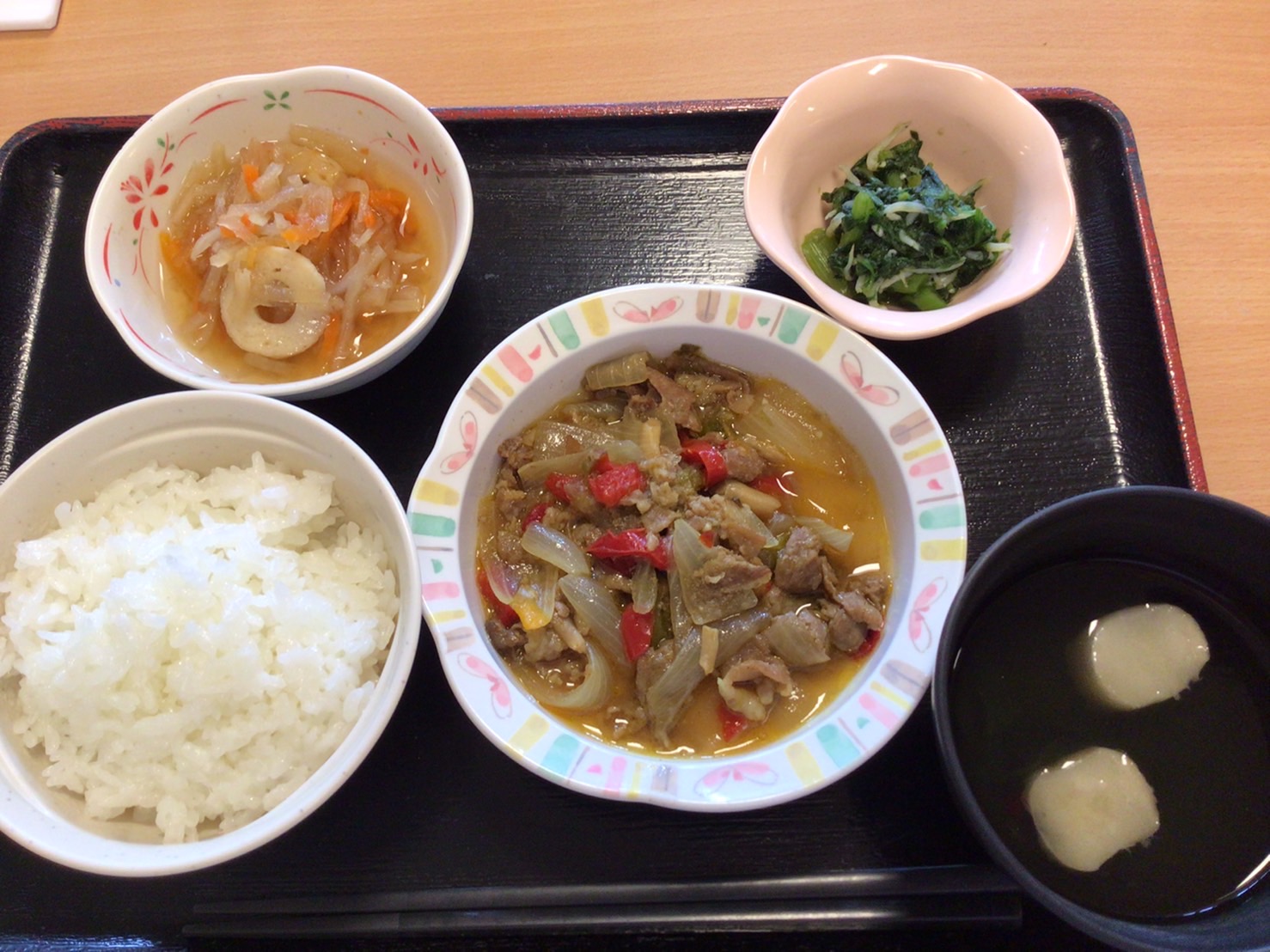【昼食】 1.米飯 2.豚肉のカレー炒め 3.切り干し大根 4.お浸し(春菊) 5.すまし汁 kcal516 蛋白質18.2g 脂質11.6g 食塩4.7g