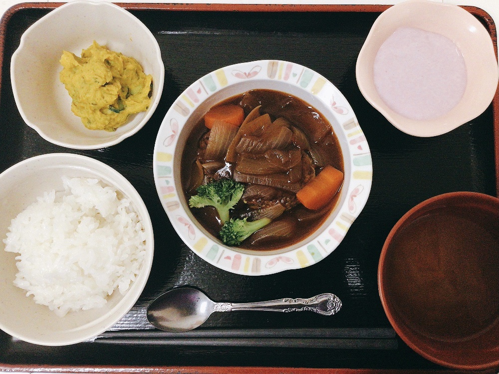 【昼食】 1.米飯 2.煮込みハンバーグ 3.かぼちゃサラダ 4.フルーチェ(いちご) 5.コンソメスープ kcal674 蛋白質16.7g 脂質23.0g 食塩2.6g