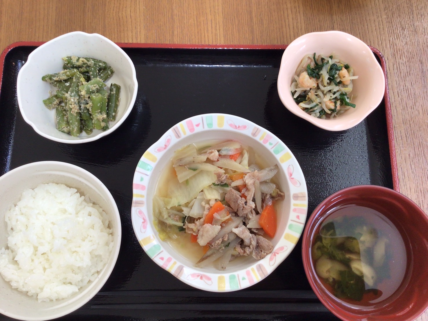 【昼食】 1.米飯 2.豚味噌バター煮 3.にらもやし炒め 4.いんげんのごま和え 5.すまし汁 kcal509 蛋白質16.8g 脂質14.6g 食塩3.9g