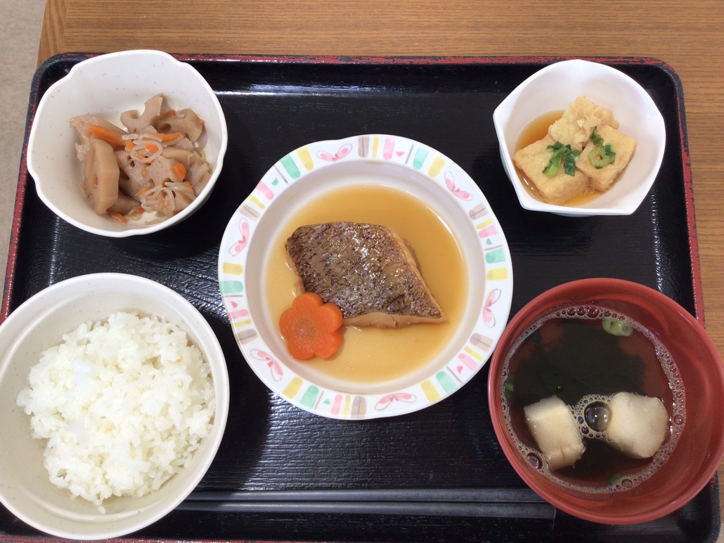 【昼食】 1.米飯 2.煮魚(かれい) 3.れんこん甘辛炒め 4.厚揚げポン酢 5.すまし汁 kcal478 蛋白質21.9g 脂質6.9g 食塩3.9g