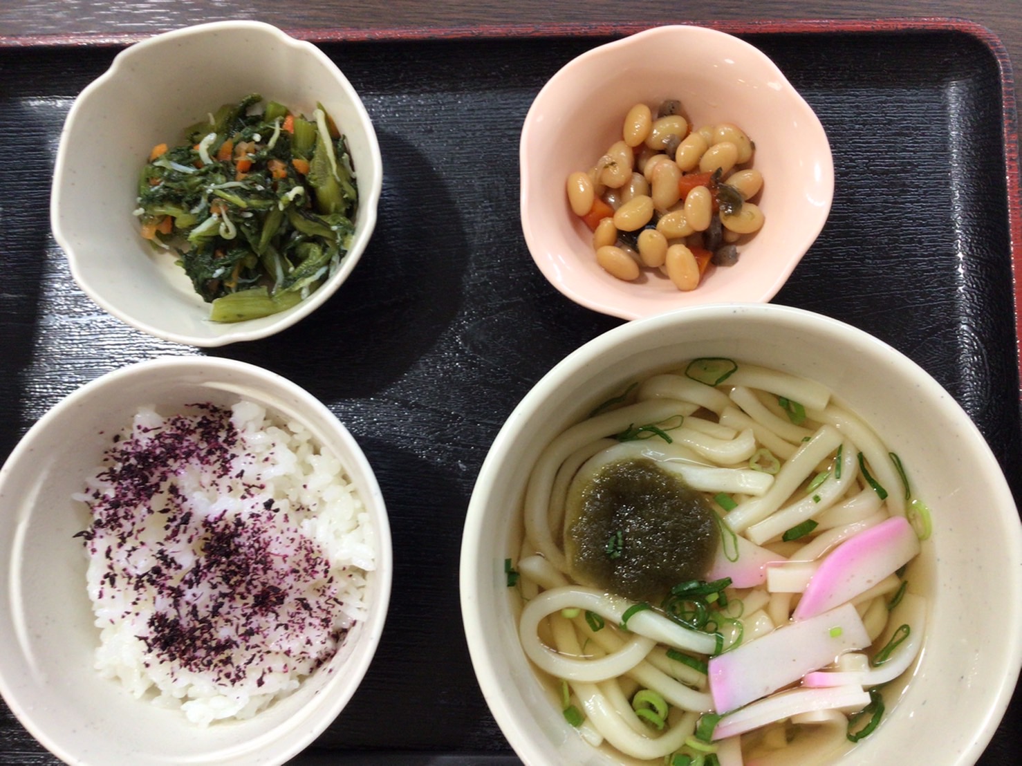 【昼食】 1.ゆかりご飯(小) 2.とろろ昆布うどん 3.春菊のゆず和え 4.野菜豆 kcal426 蛋白質15.4g 脂質3.9g 食塩3.9g