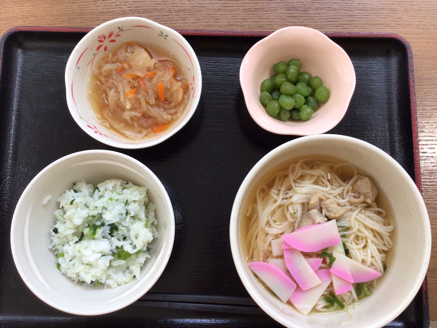 【昼食】 1.青菜しらすご飯(小) 2.にゅう麺 3.切り干し大根 4.うぐいす豆 kcal477 蛋白質16.2g 脂質4.5g 食塩4.4g