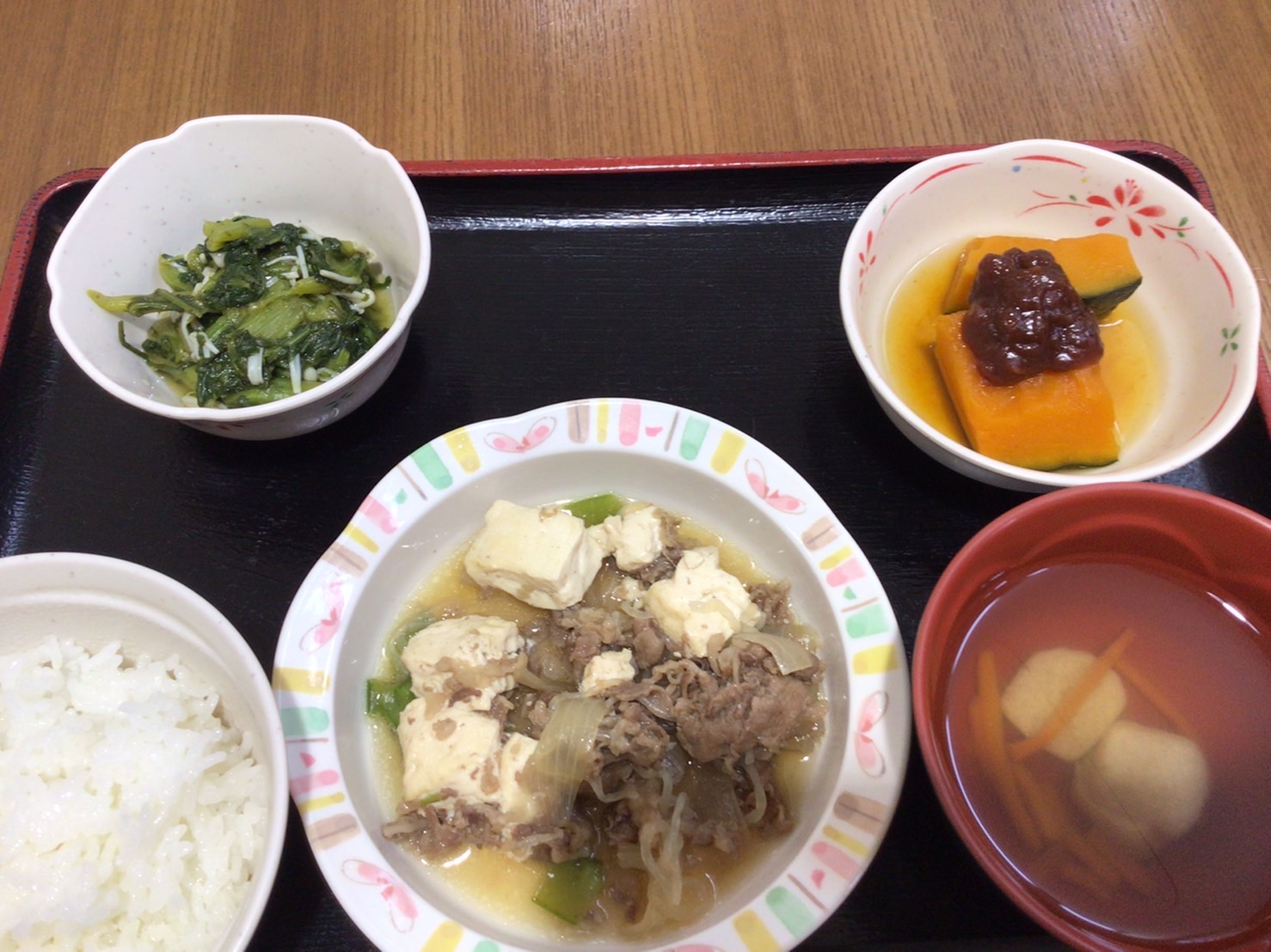 【昼食】 1.米飯 2.肉豆腐 3.かぼちゃのいとこ煮 4.春菊のゆず和え 5.すまし汁 kcal514 蛋白質17.2g 脂質5.1g 食塩4.3g