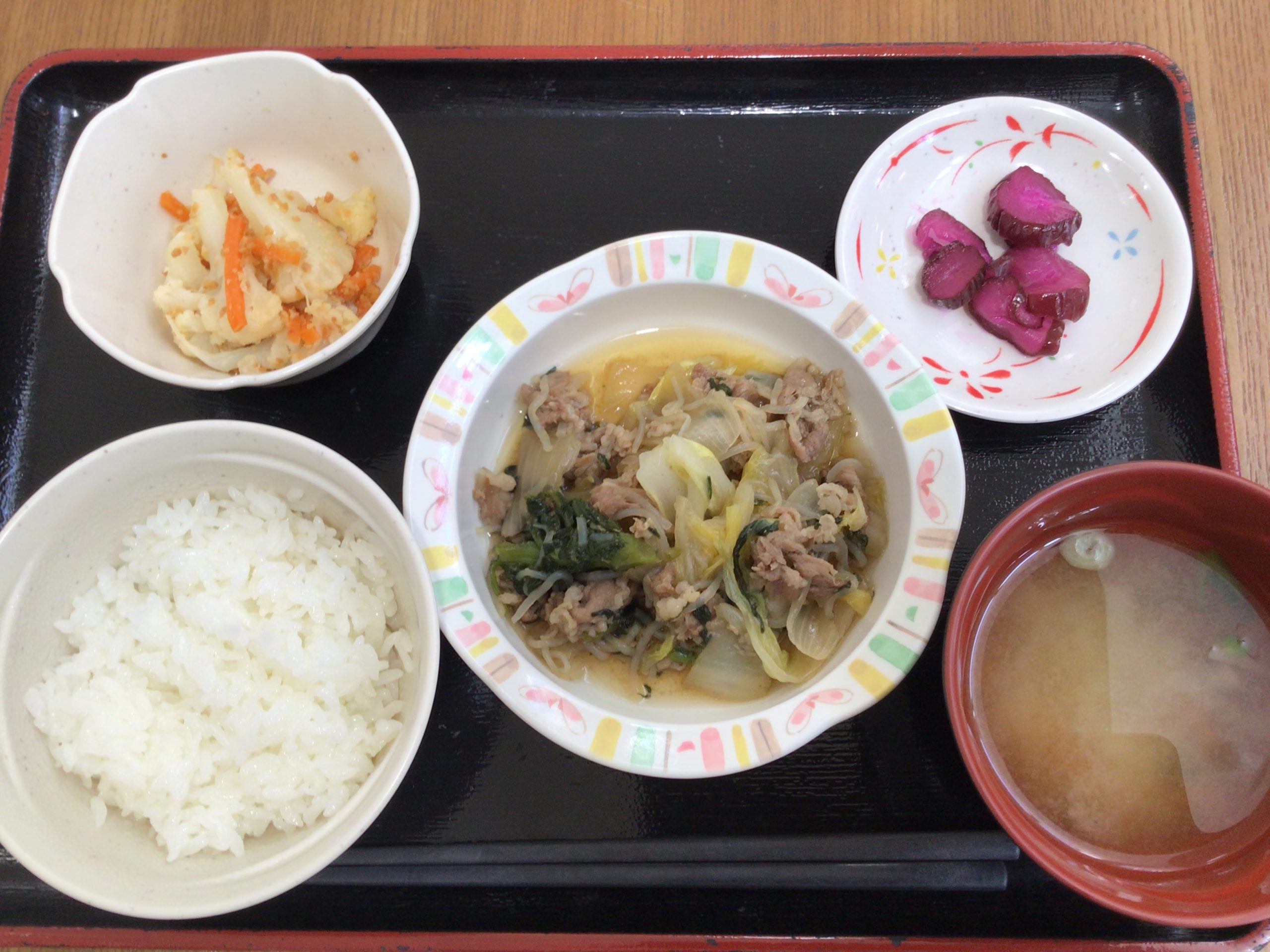 【昼食】 1.米飯 2.すき焼き風煮 3.カリフラワーピーナツ和え 4.漬物 5.みそ汁 kcal446 蛋白質16.1g 脂質6.3g 食塩2.4g