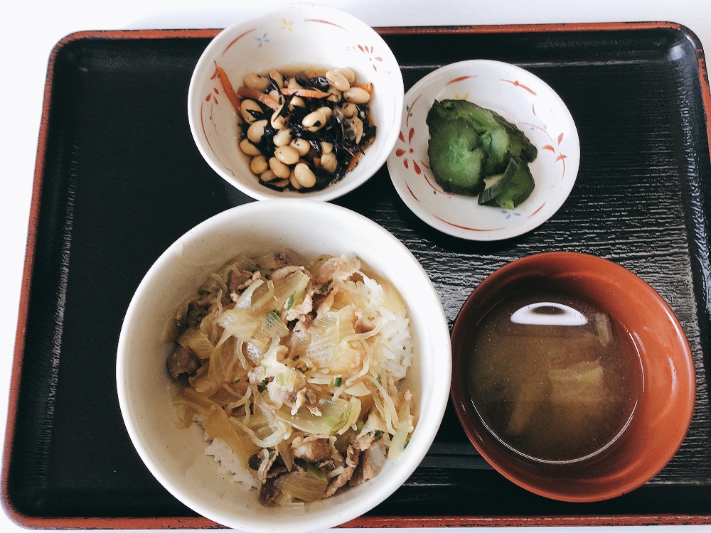 【昼食】 1.豚丼 2.ひじき豆煮 3.漬物 4.みそ汁 kcal493 蛋白質16.7g 脂質9.7g 食塩3.3g