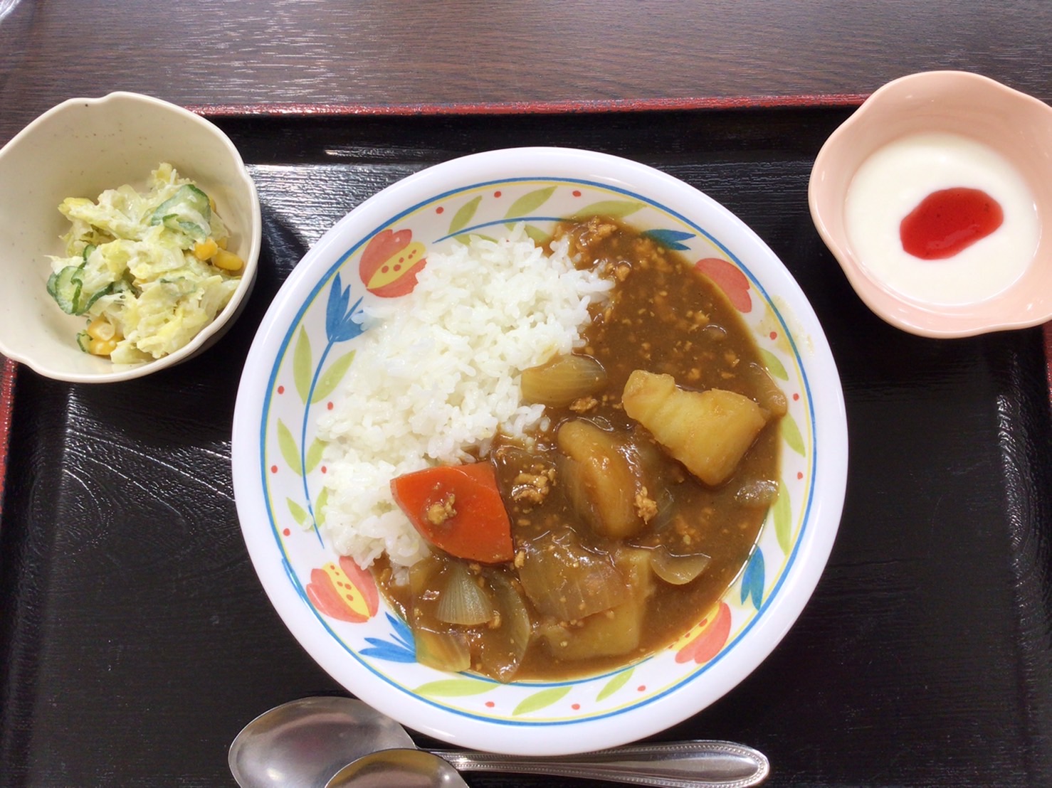【昼食】 1.カレーライス 2.コールスローサラダ 3.ヨーグルト(いちごソース) kcal563 蛋白質9.1g 脂質16.6g 食塩2.0g