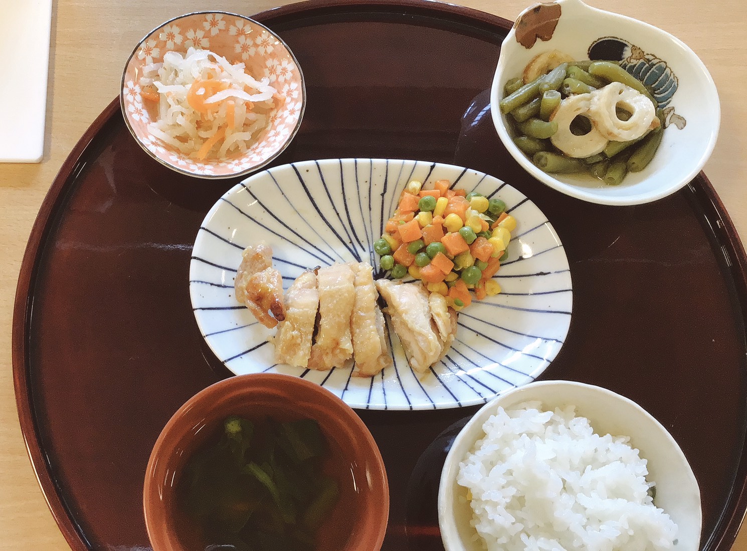 【昼食】 1.米飯 2.鶏肉の味噌焼き(添)MBソテー 3.いんげんの煮物 4.切干大根なます 5.すまし汁 kcal614 蛋白質21.1g 脂質17.3g 食塩4.2g