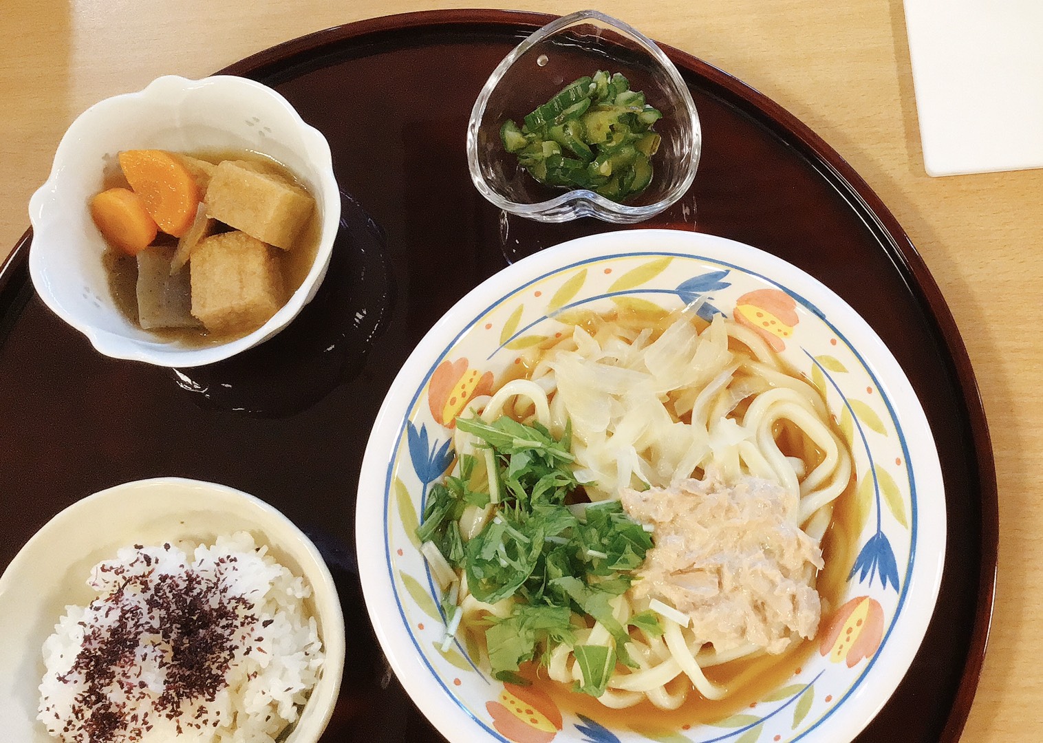 【昼食】 1.ゆかりご飯(小) 2.ツナマヨぶっかけうどん 3.厚揚げの煮物 4.きゅうり塩昆布和え kcal504 蛋白質14.7g 脂質11.9g 食塩3.8g