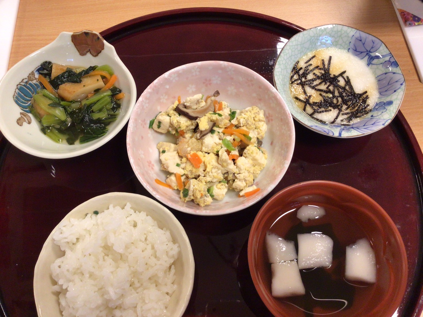 【昼食】 1.米飯 2.炒り豆腐 3.小松菜の煮物 4.やまいもトロロ 5.すまし汁 kcal498 蛋白質18.5g 脂質10.1g 食塩4.3g