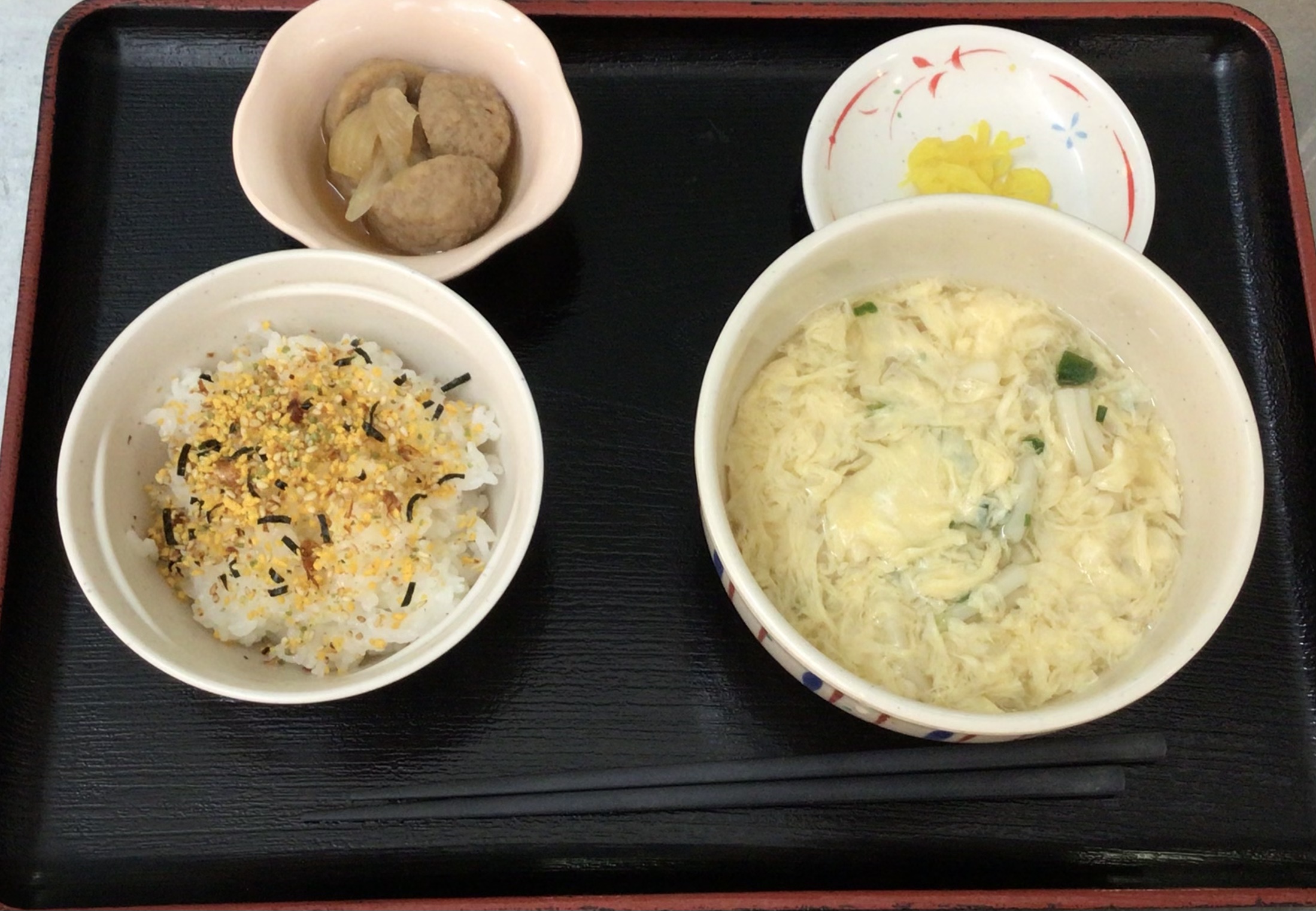 【昼食】 1.米飯 2.卵あんかけうどん 3.肉団子甘煮 4.漬物