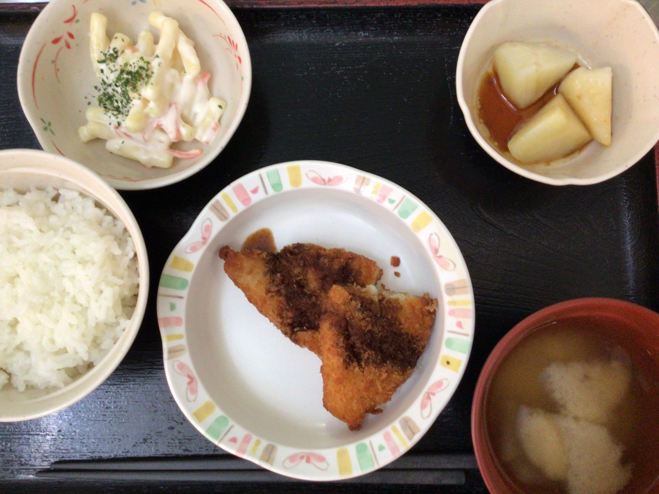 【昼食】 1.米飯 2.白身魚のフライ 3.マカロニサラダ 4.じゃがいもバター醤油 5.みそ汁