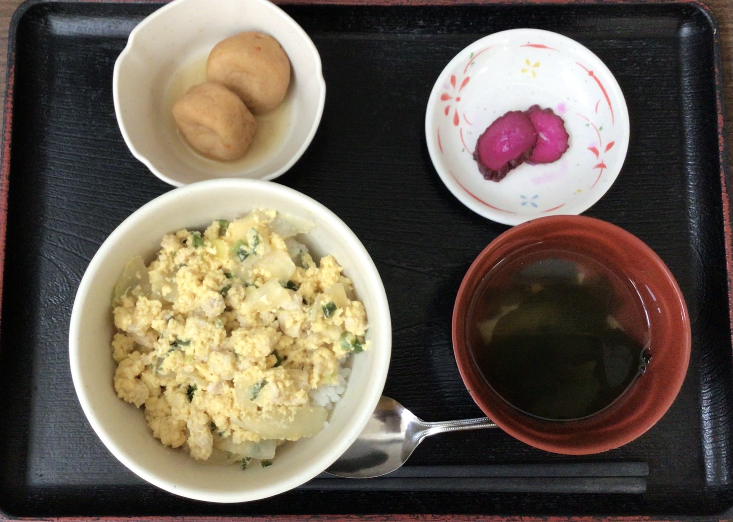 【昼食】 1.甘辛ミンチの卵とじ丼 2.がんも煮 3.漬物 4.すまし汁