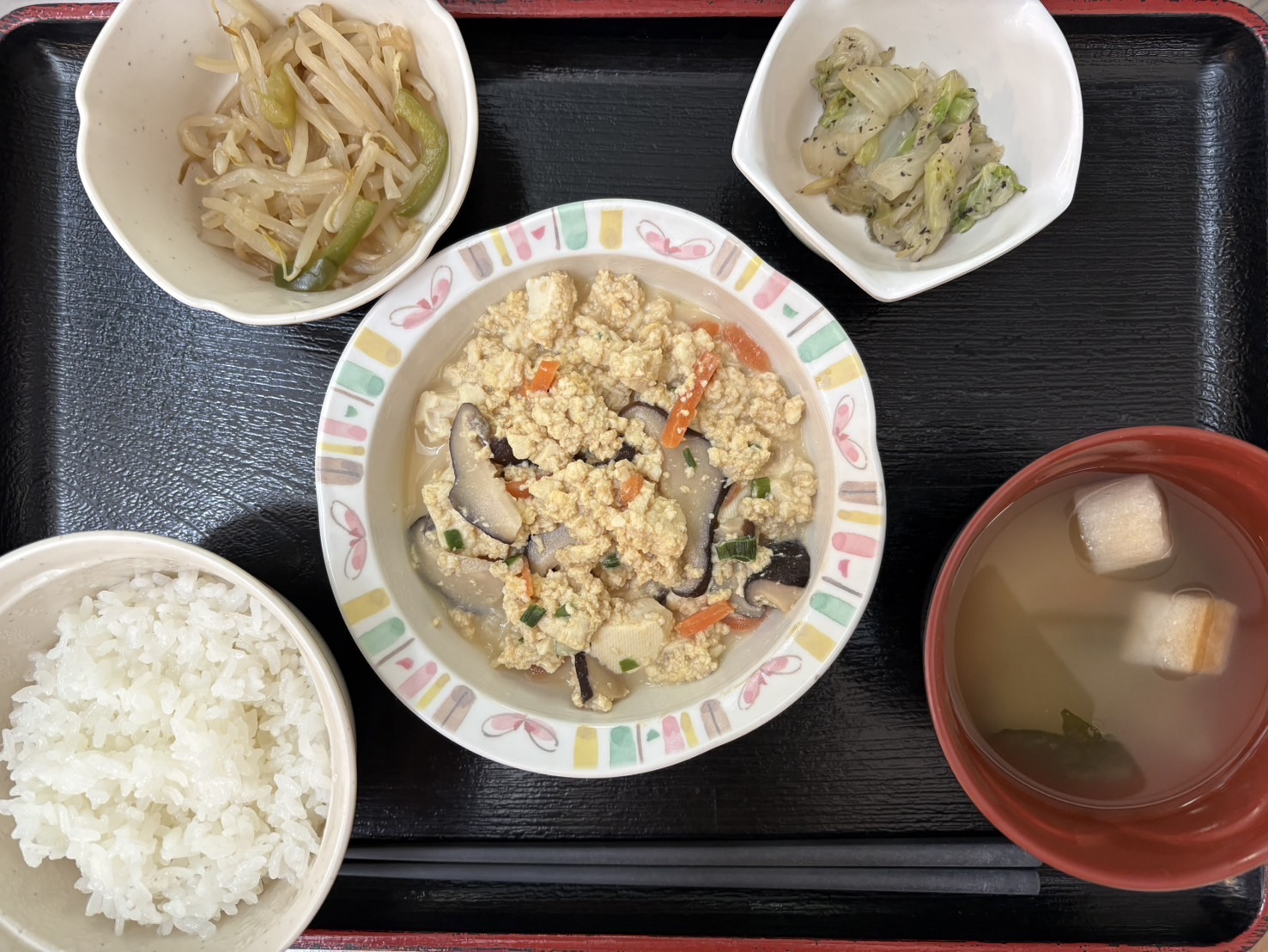 【昼食】 1.米飯 2.炒り豆腐 3.もやし炒め 4.白菜ゆかり和え 5.みそ汁