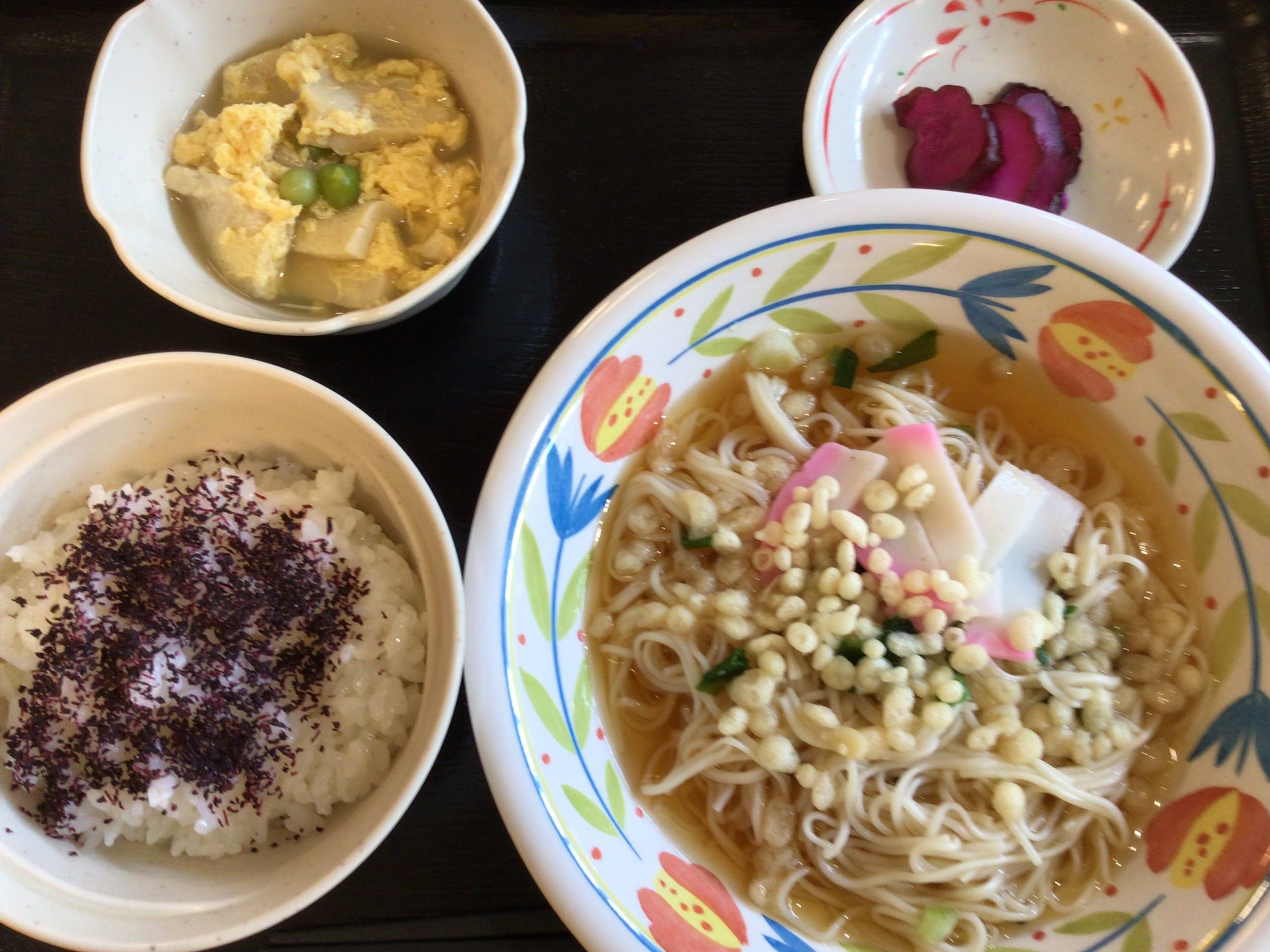 【昼食】 1.ゆかりご飯(小) 2.冷やしそうめん 3.高野の卵とじ 4.漬物