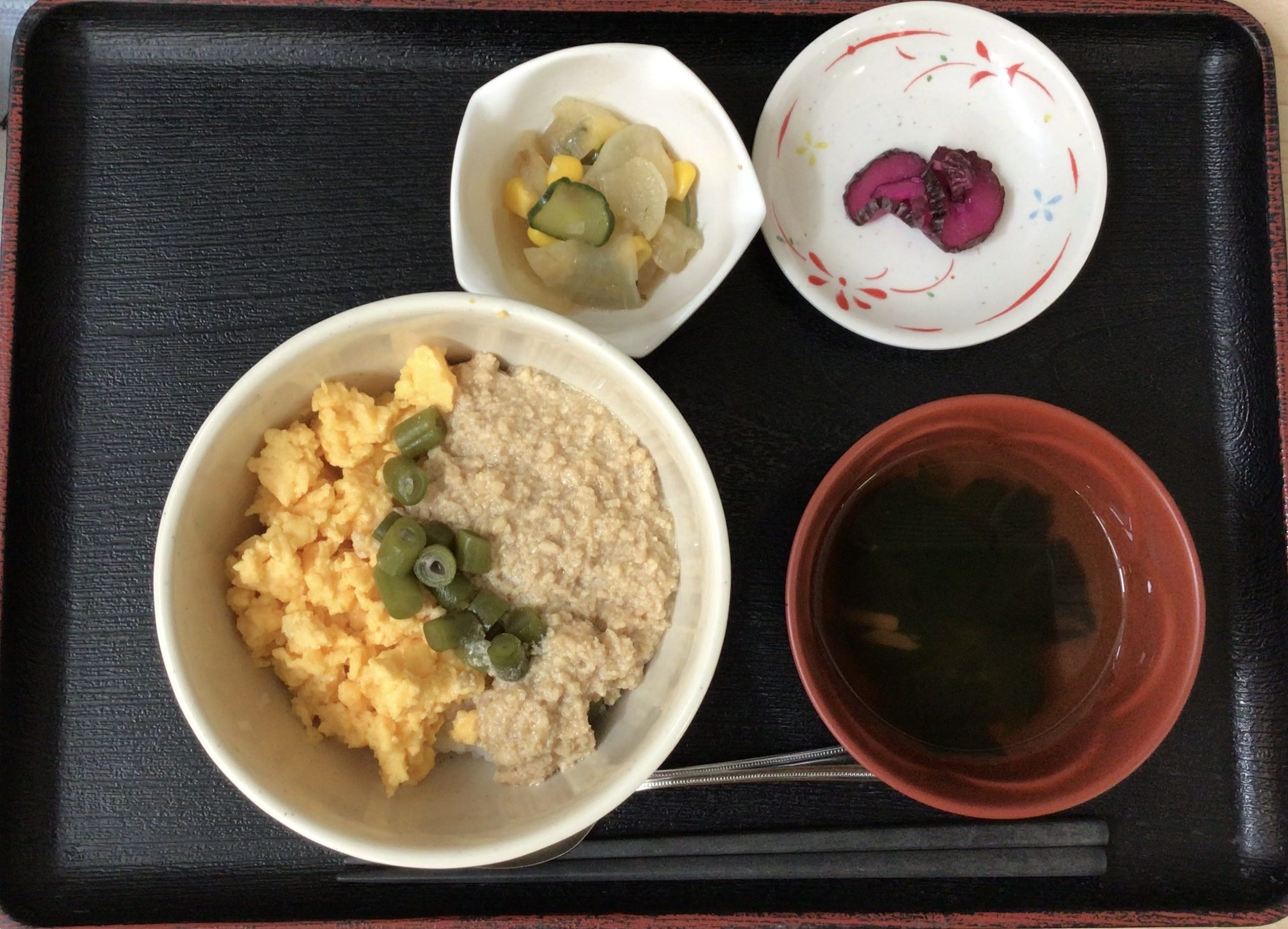 【昼食】 1.三色そぼろ丼 2.大根サラダ 3.漬物 4.すまし汁