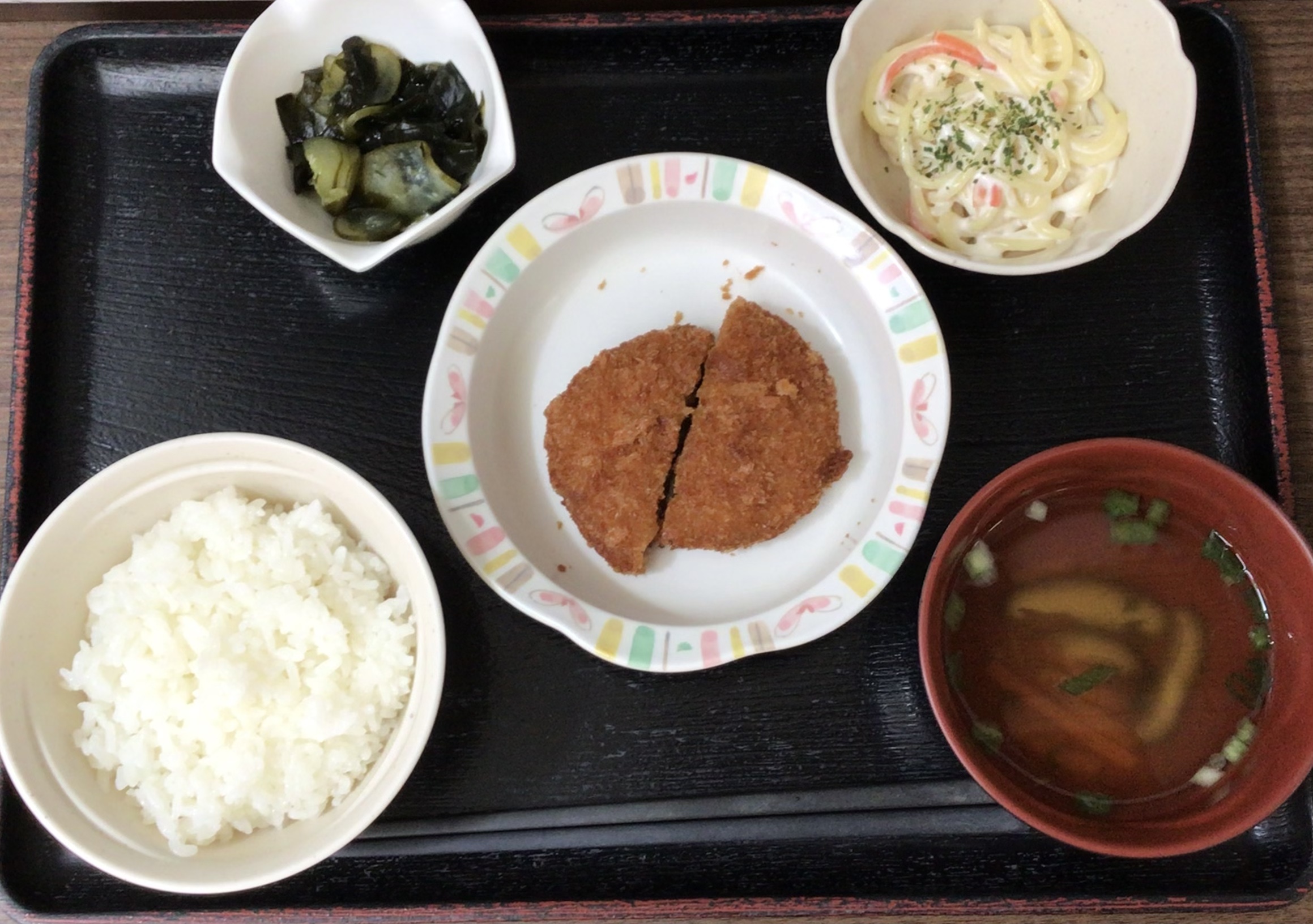 【昼食】 1.米飯 2.ミンチカツ 3.スパゲティサラダ 4.胡瓜とワカメの酢の物 5.すまし汁