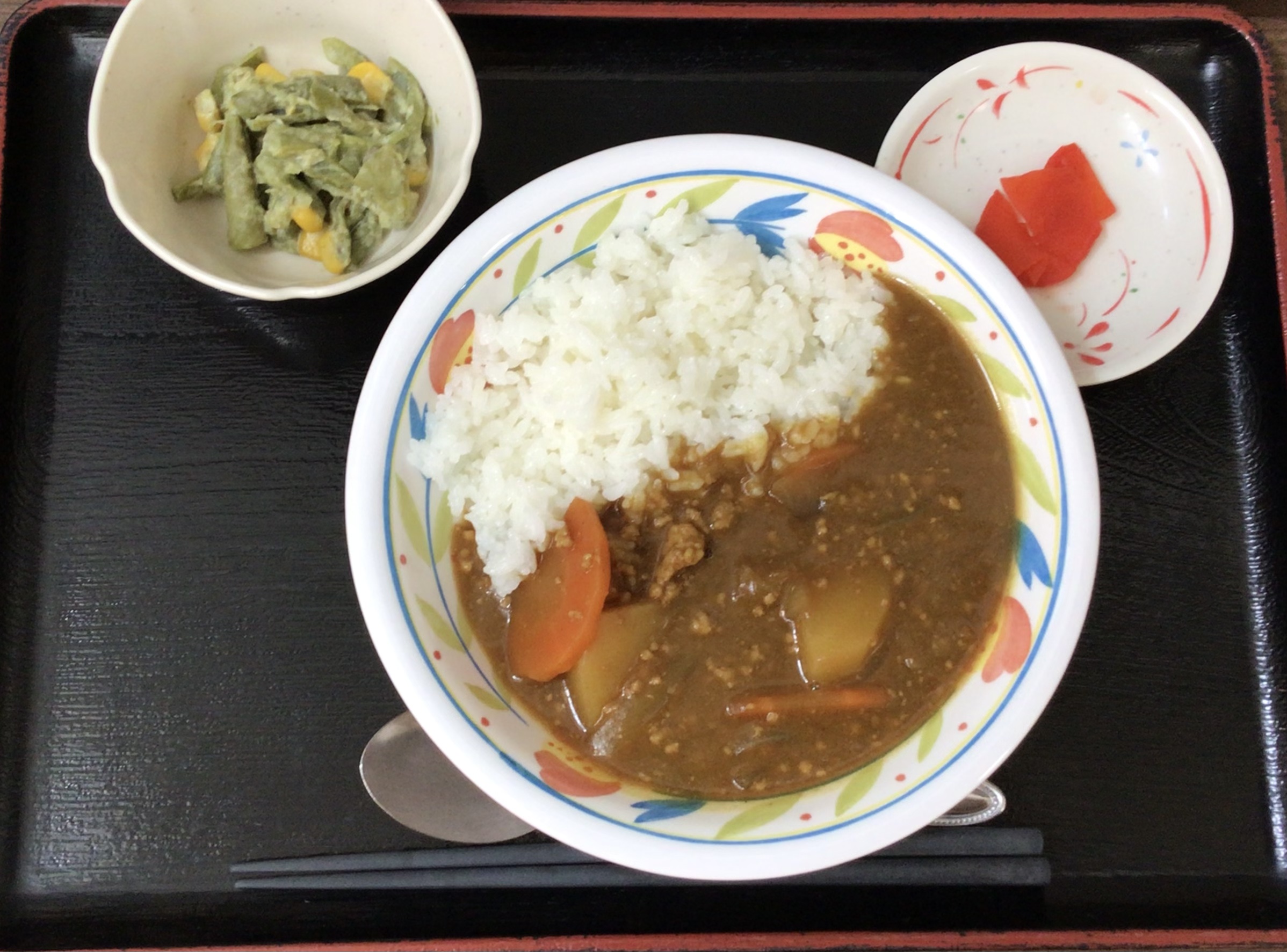 【昼食】 1.カレーライス 2.インゲンのサラダ 3.福神漬け