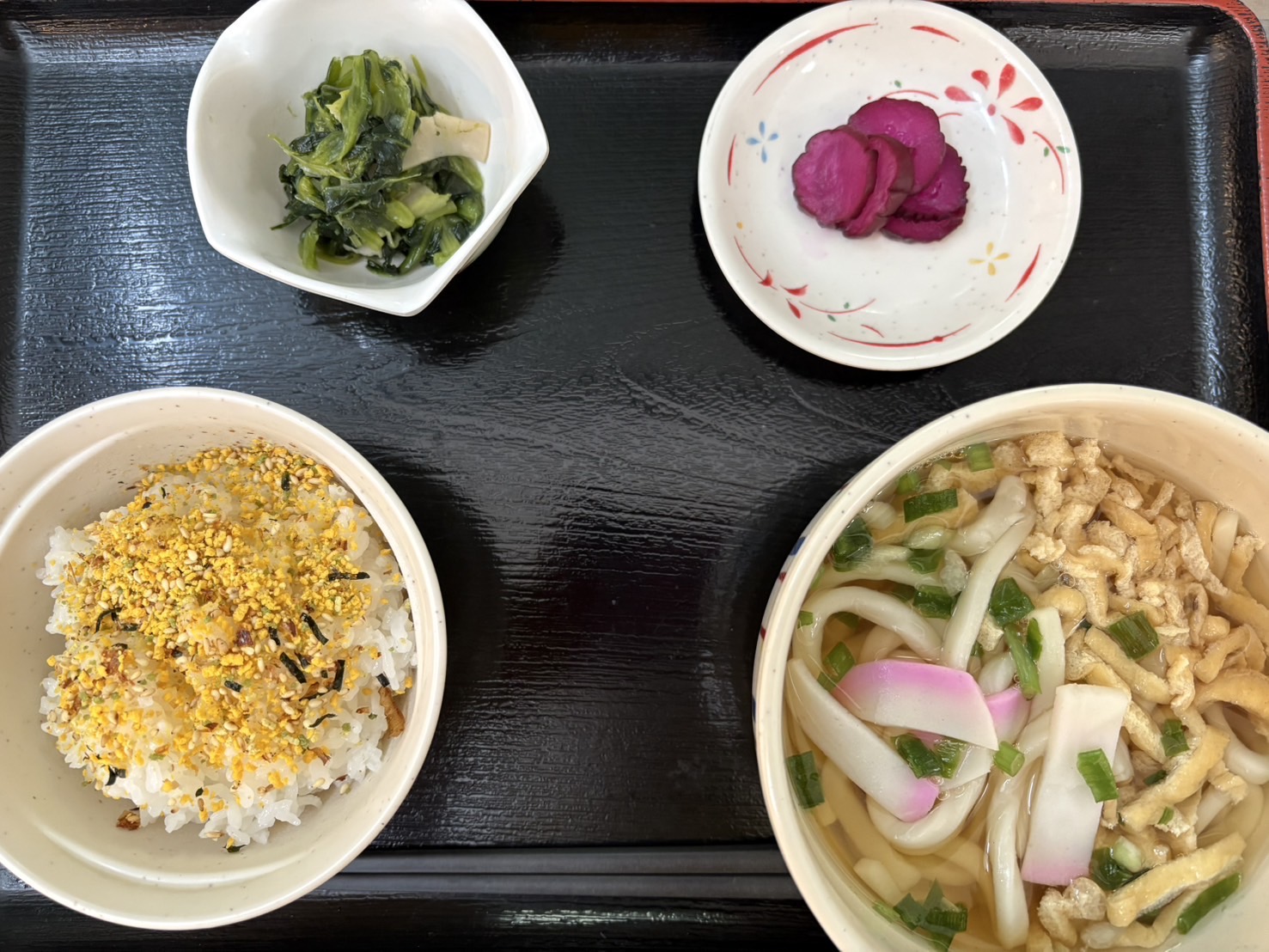 【昼食】 1.米飯 2.きざみうどん 3.青菜炒め 4.漬物