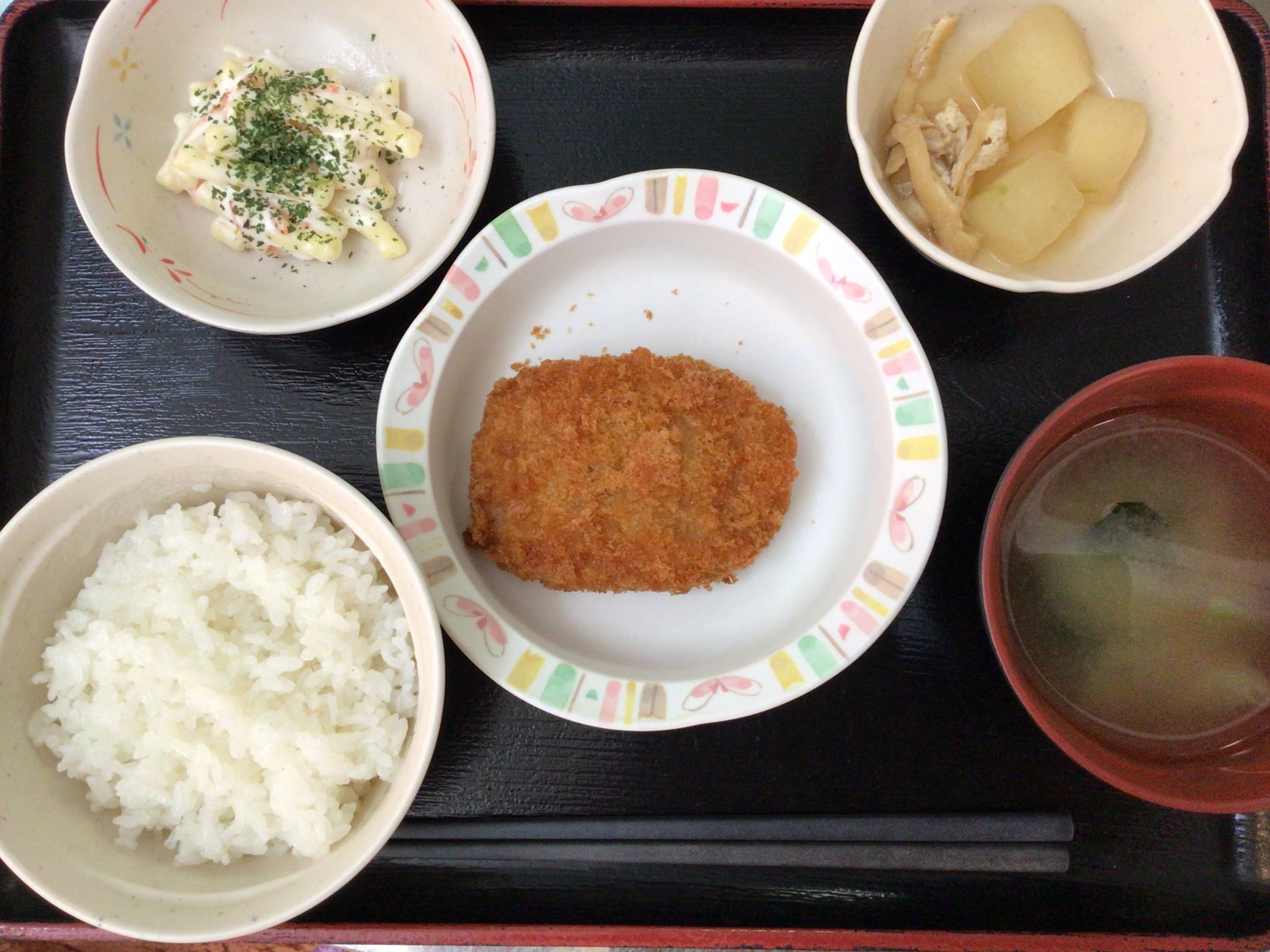 【昼食】 1.米飯 2.コロッケ 3.マカロニサラダ 4.とうがん煮 5.みそ汁