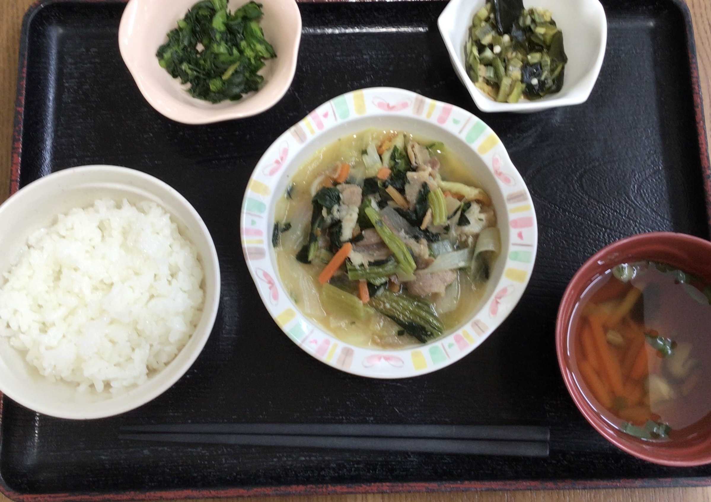 【昼食】 1.米飯 2.豚と青梗菜みそ炒め 3.おくらとワカメポン酢和 4.菜の花お浸し 5.すまし汁