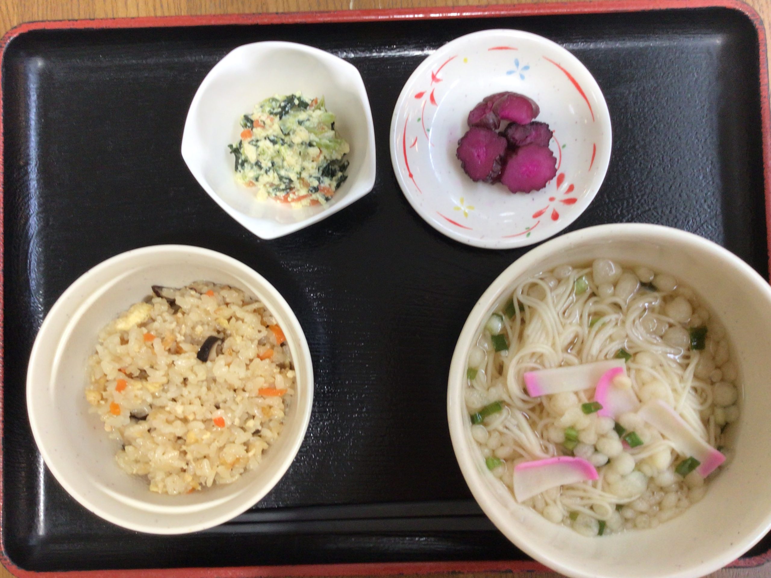 【昼食】 1.かやくご飯(小) 2.にゅう麺 3.しら和え 4.漬物