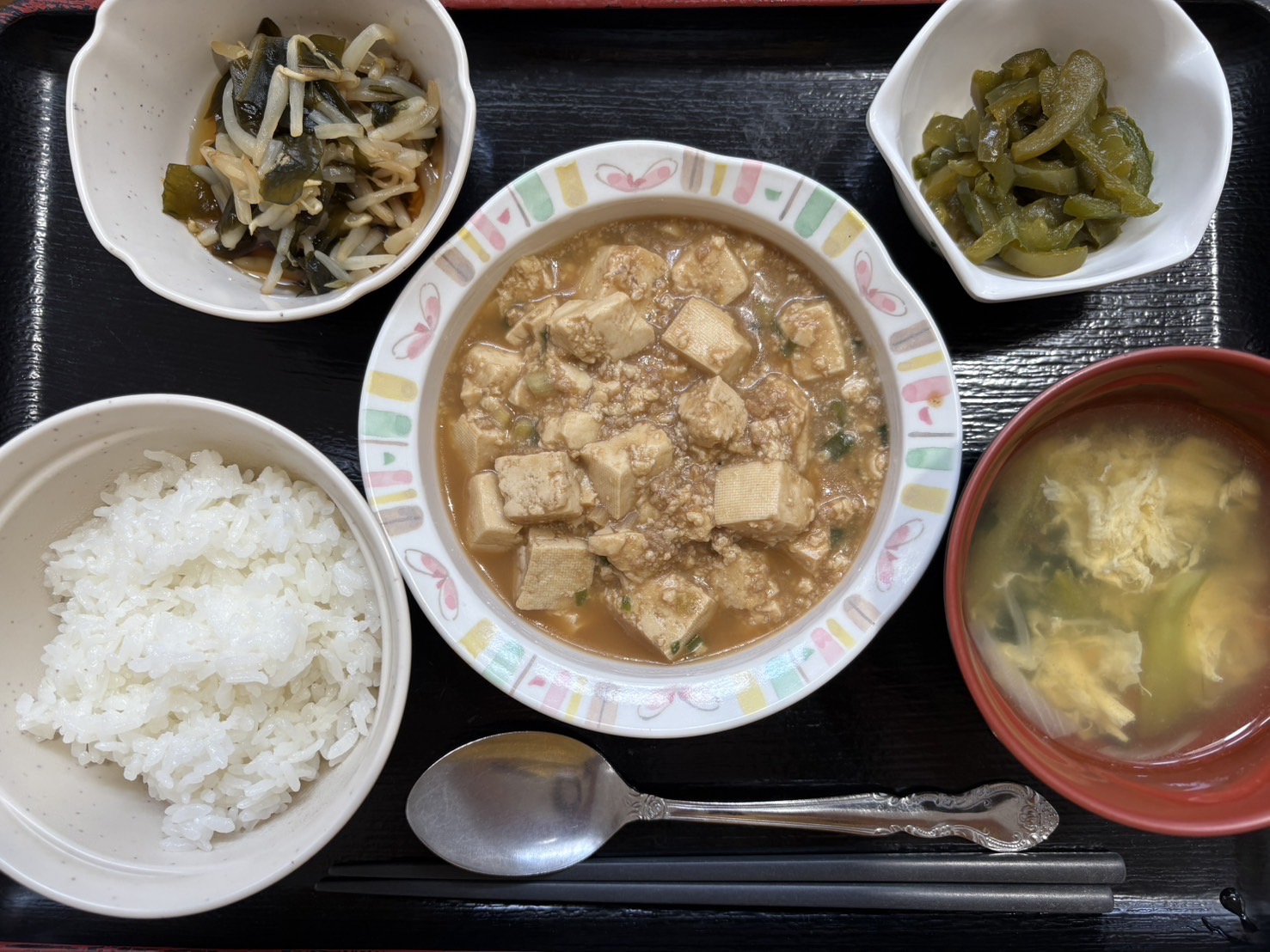 【昼食】 1.米飯 2.肉味噌豆腐 3.ピーマン甘辛煮 4.もやしとワカメポン酢 5.中華風スープ