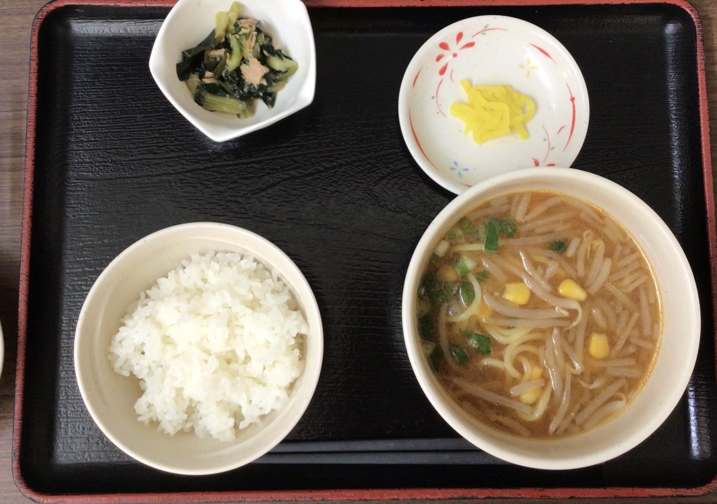 【昼食】 1.米飯 2.味噌ラーメン 3.青梗菜とツナの和え物 4.漬物