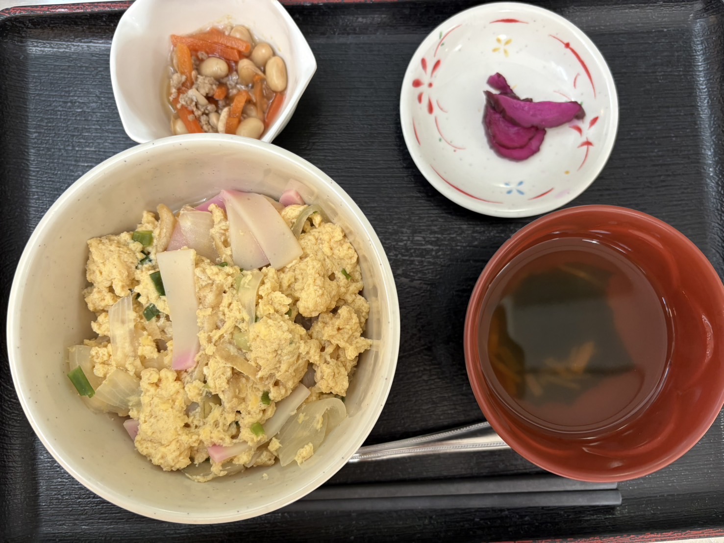 【昼食】 1.木の葉丼 2.豚と大豆のうま煮 3.漬物 4.すまし汁