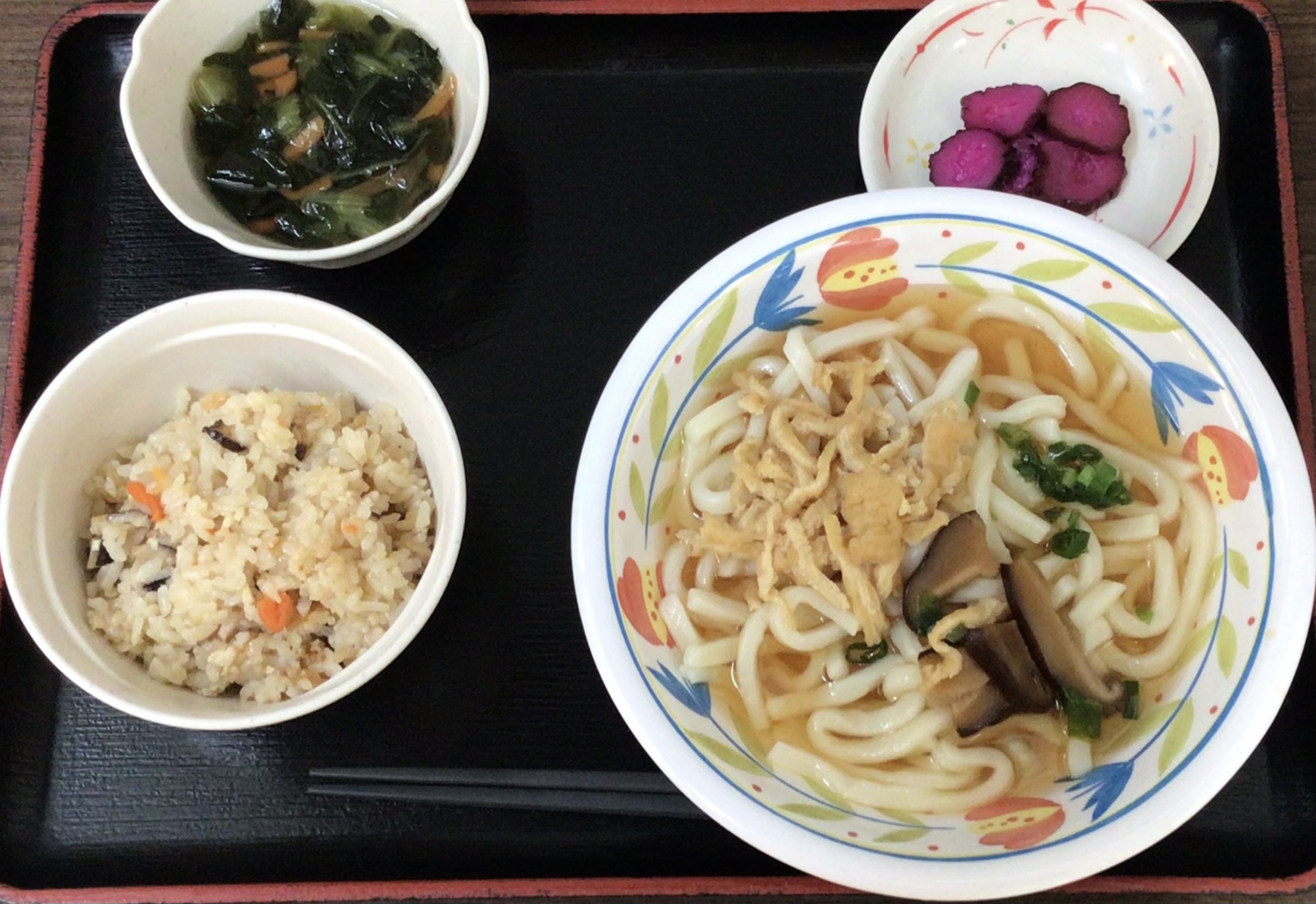 【昼食】 1.炊き込みご飯 2.冷やしうどん 3.小松菜煮浸し 4.漬物