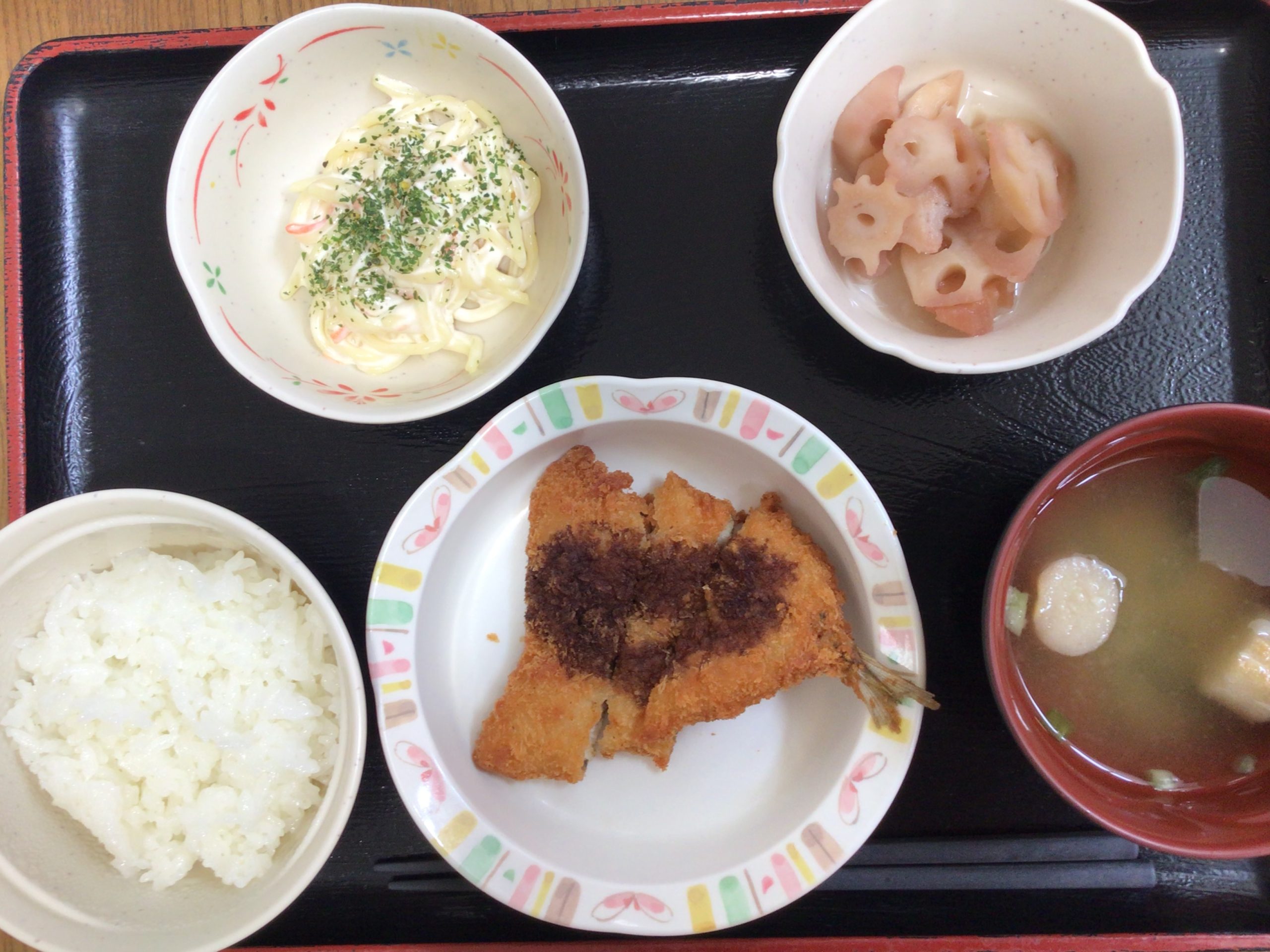 【昼食】 1.米飯 2.アジフライ 3.スパゲティサラダ 4.レンコン甘酢 5.みそ汁