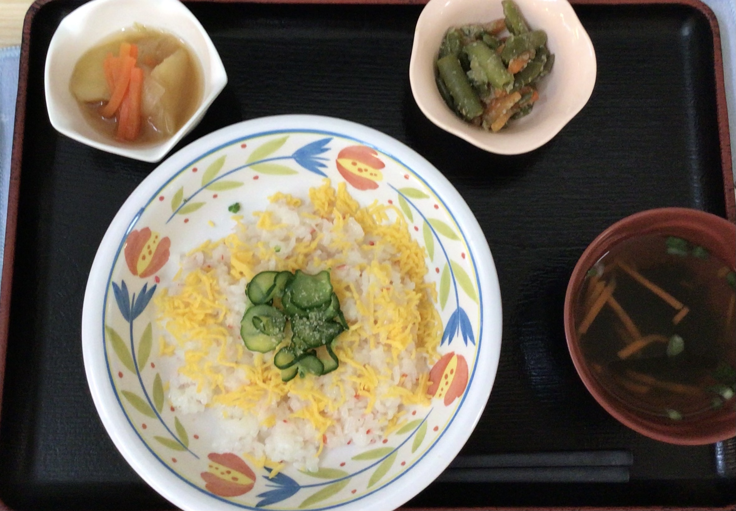 【昼食】 1.サラダチラシ 2.いんげんごま味噌和え 3.じゃが芋煮物 4.すまし汁