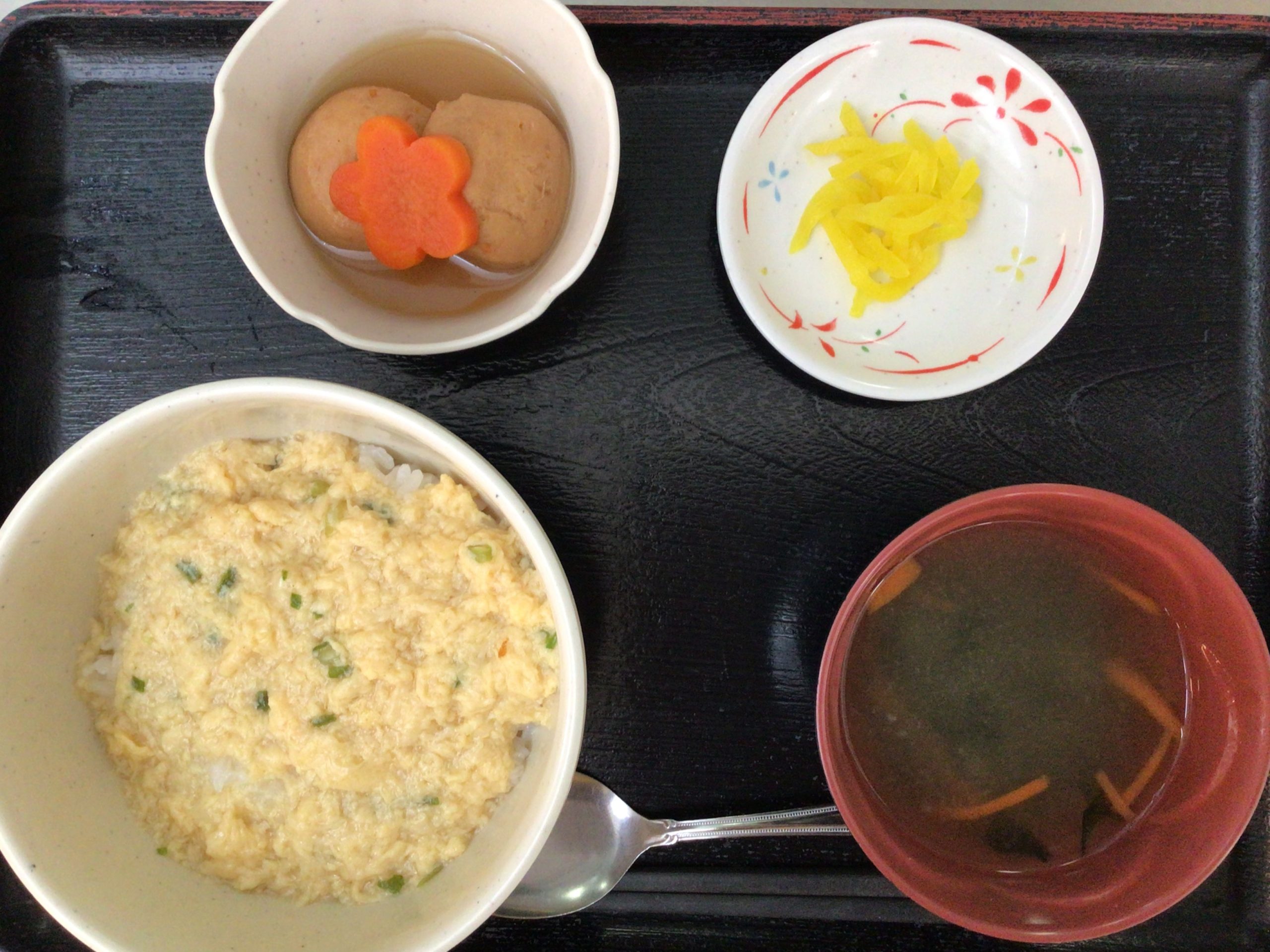 【昼食】 1.卵あんかけ丼 2.がんも煮 3.漬物 4.みそ汁