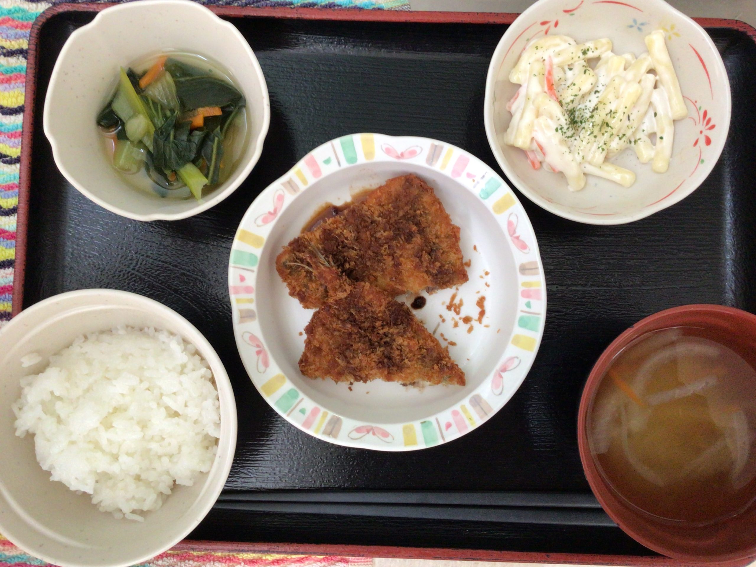 【昼食】 1.米飯 2.魚フライ 3.マカロニサラダ 4.青梗菜スープ煮 5.みそ汁