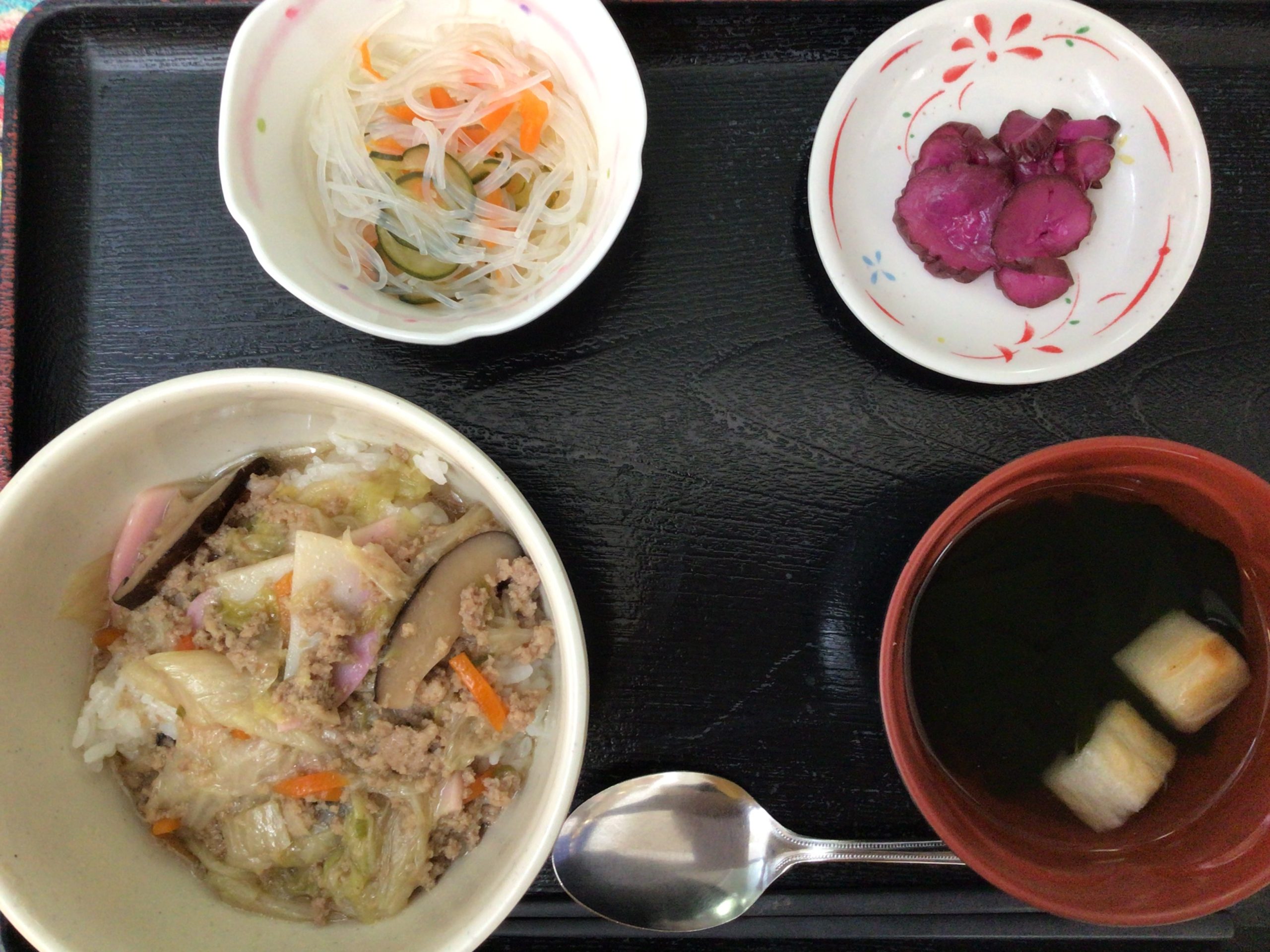 【昼食】 1.中華丼 2.春雨酢 3.漬物 4.すまし汁