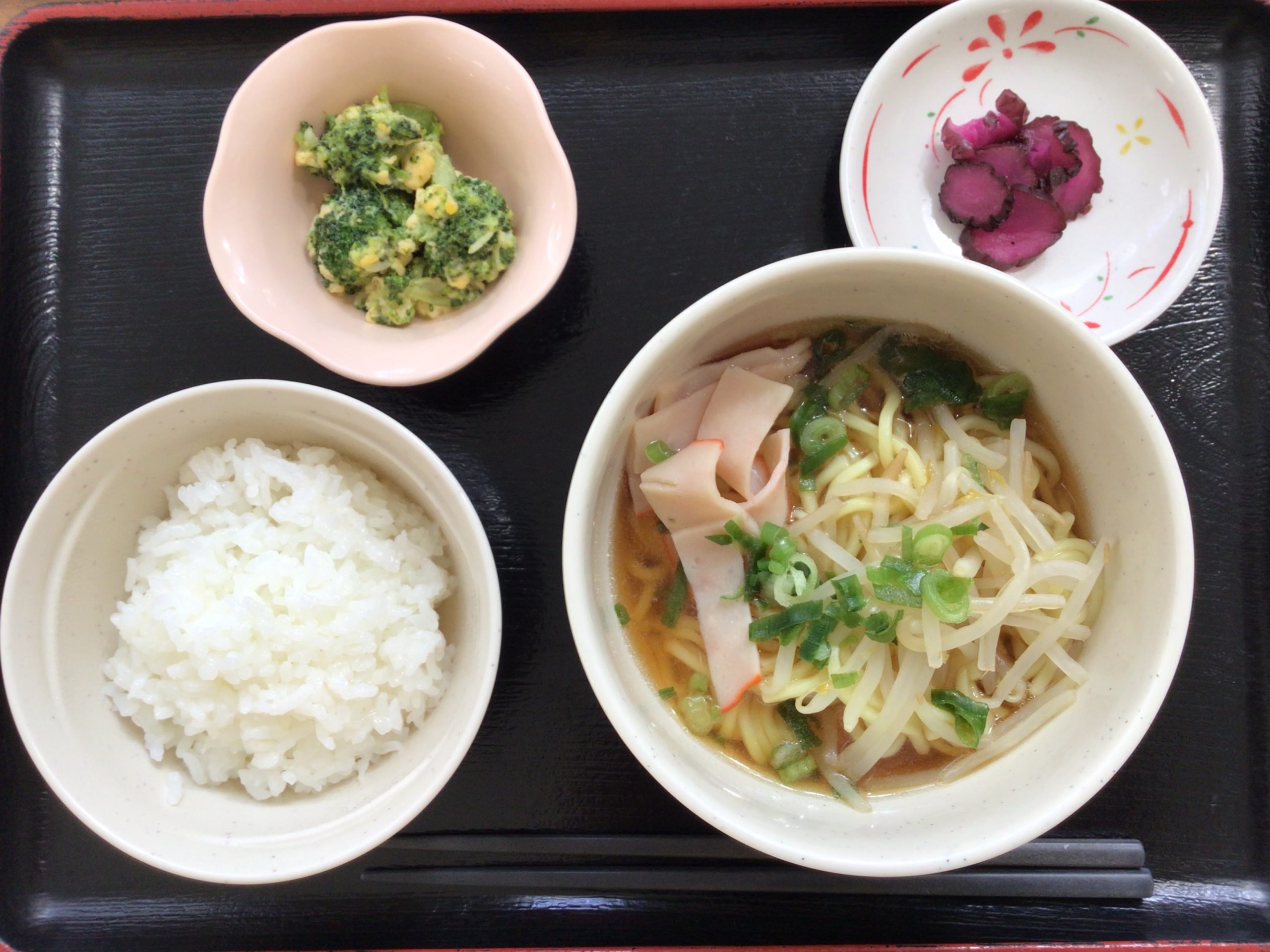 【昼食】 1.米飯 2.醤油ラーメン 3.ブロッコリーと卵のサラダ 4.漬物
